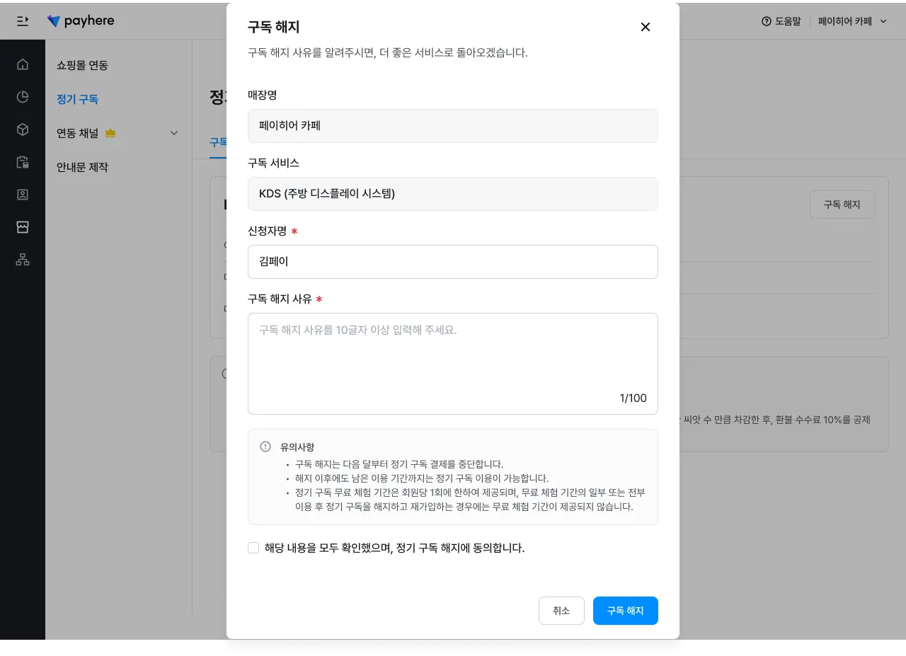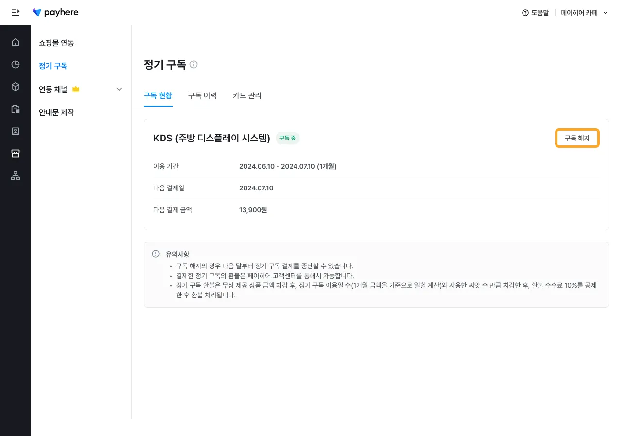 페이히어 대시보드에서 구독 현황을 확인하고 해지할 수 있습니다.