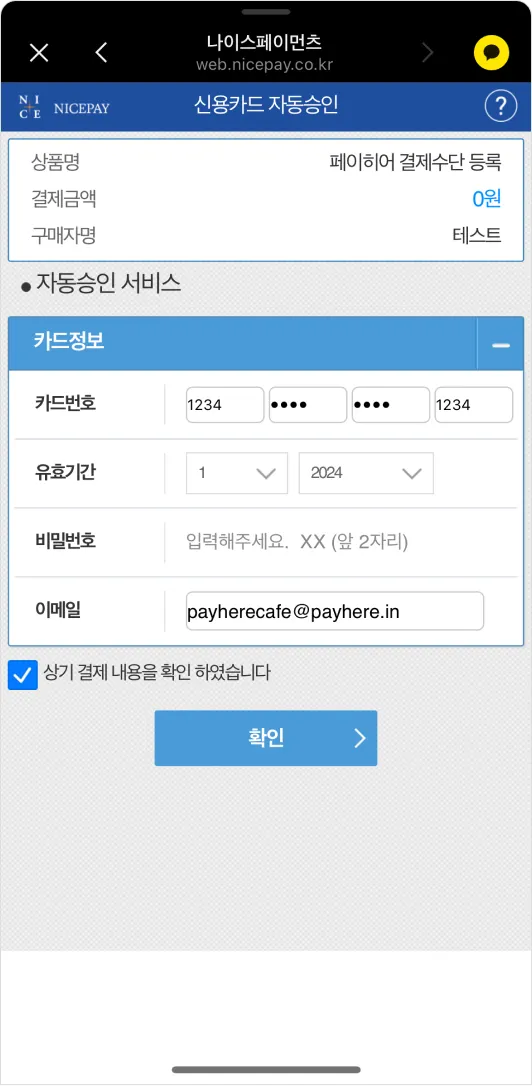 4) 결제 수단으로 등록할 카드 정보를 입력한 후 [확인 >]을 누르면 완료됩니다.