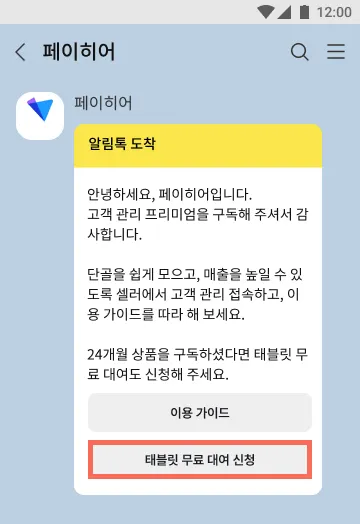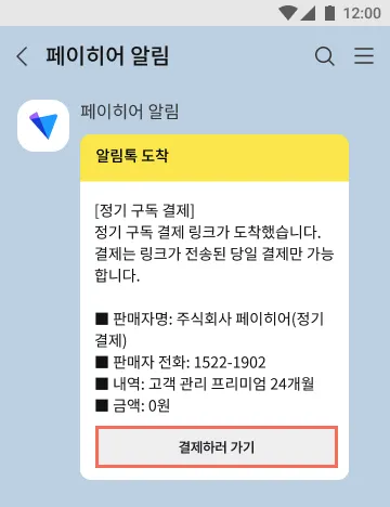 5) ‘페이히어’ 채널로 구독 완료 알림톡이 전송돼요.