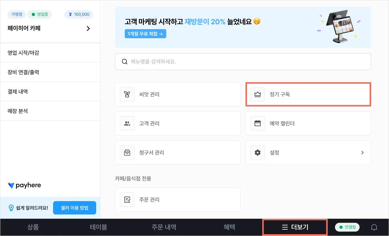 1) [더보기] 탭에서 [정기 구독]을 눌러주세요.