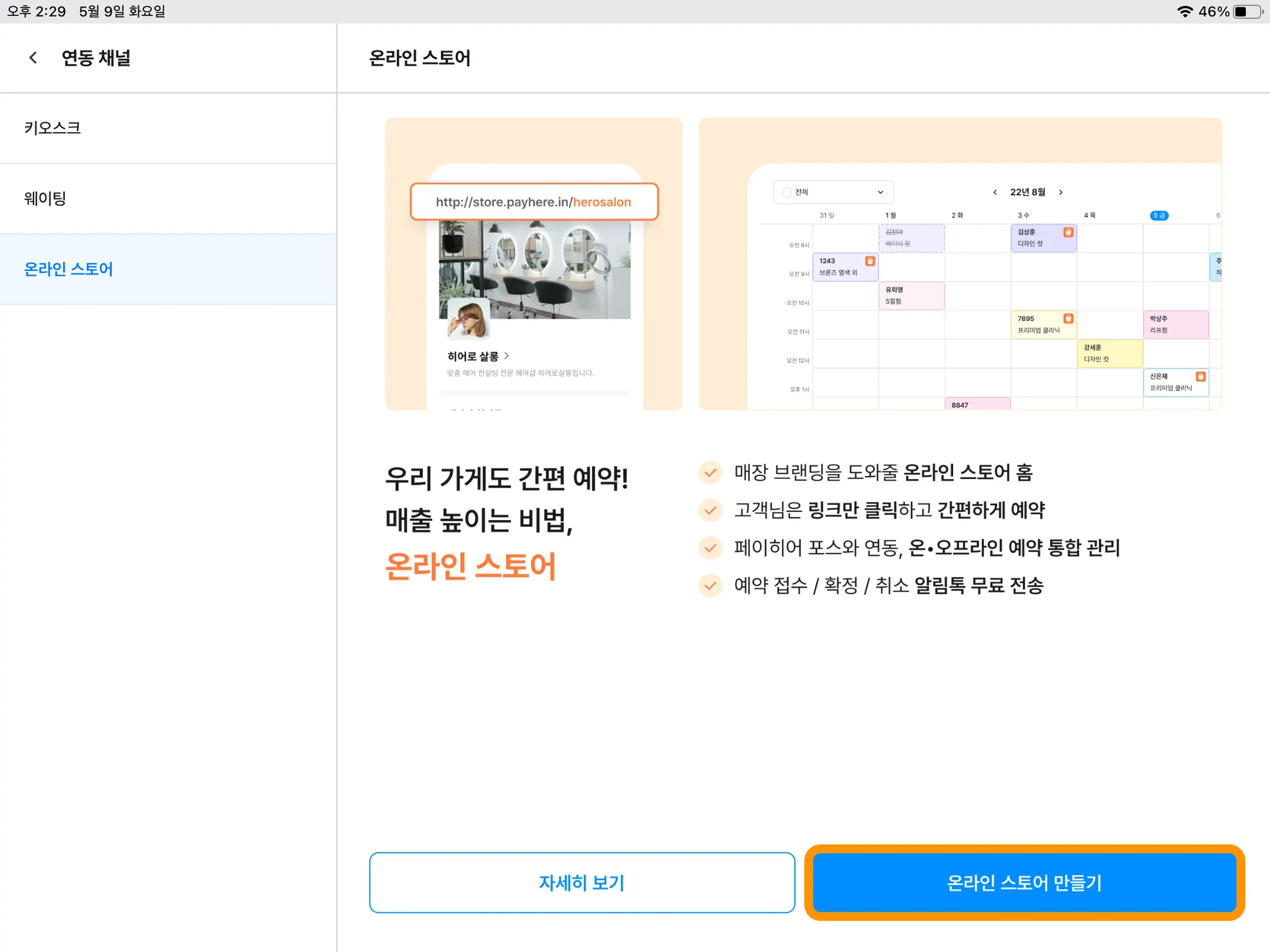 4) 생성된 온라인 스토어 통해 예약을 받을 수 있습니다.