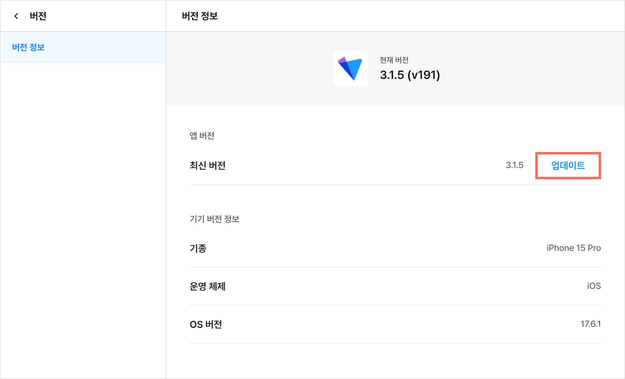 ② [버전] → [버전 정보]에서 확인해 주세요.