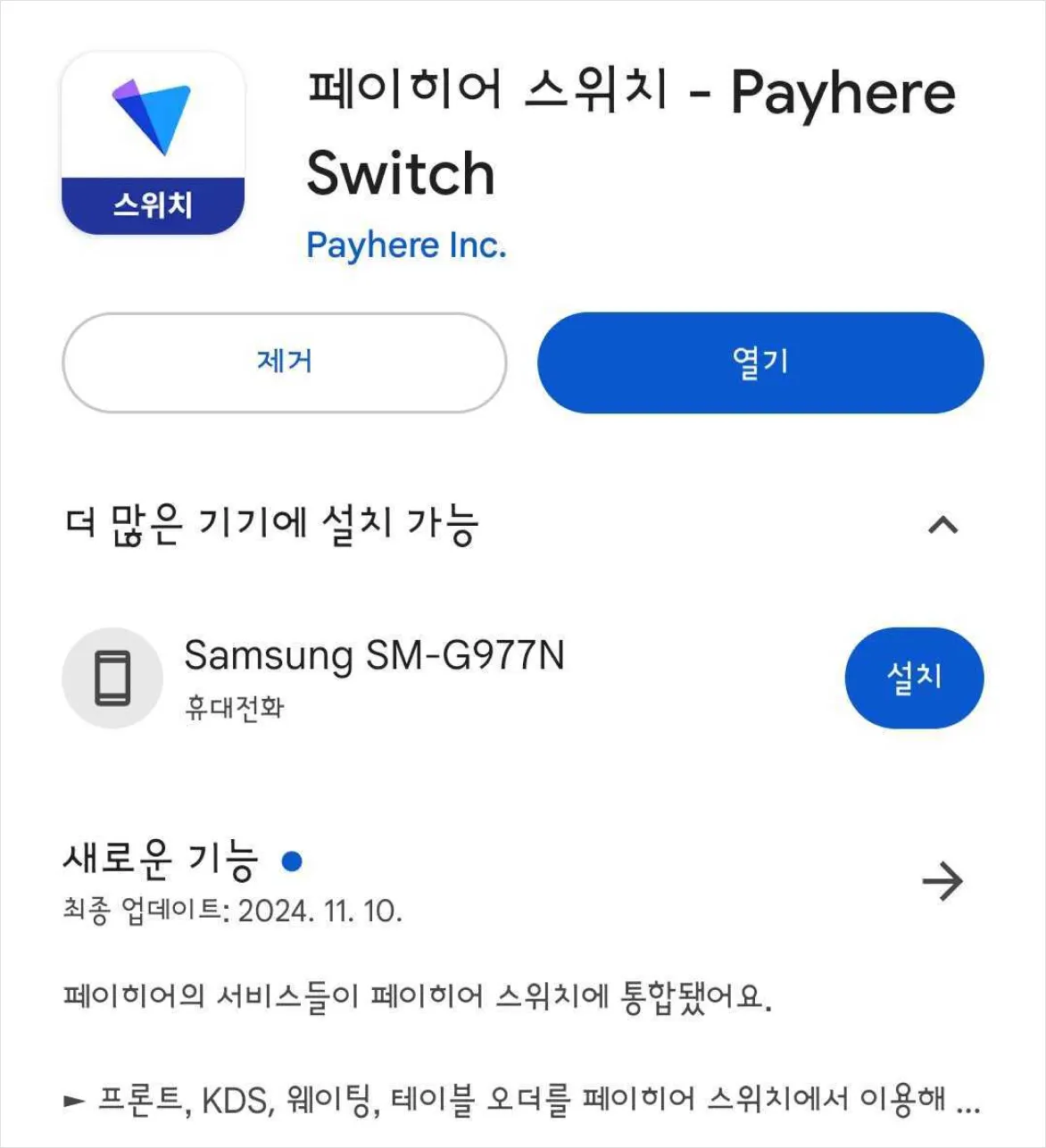 1) 스위치 앱 사용을 위해 페이히어 셀러(POS) 최신 버전을 확인해 주세요.