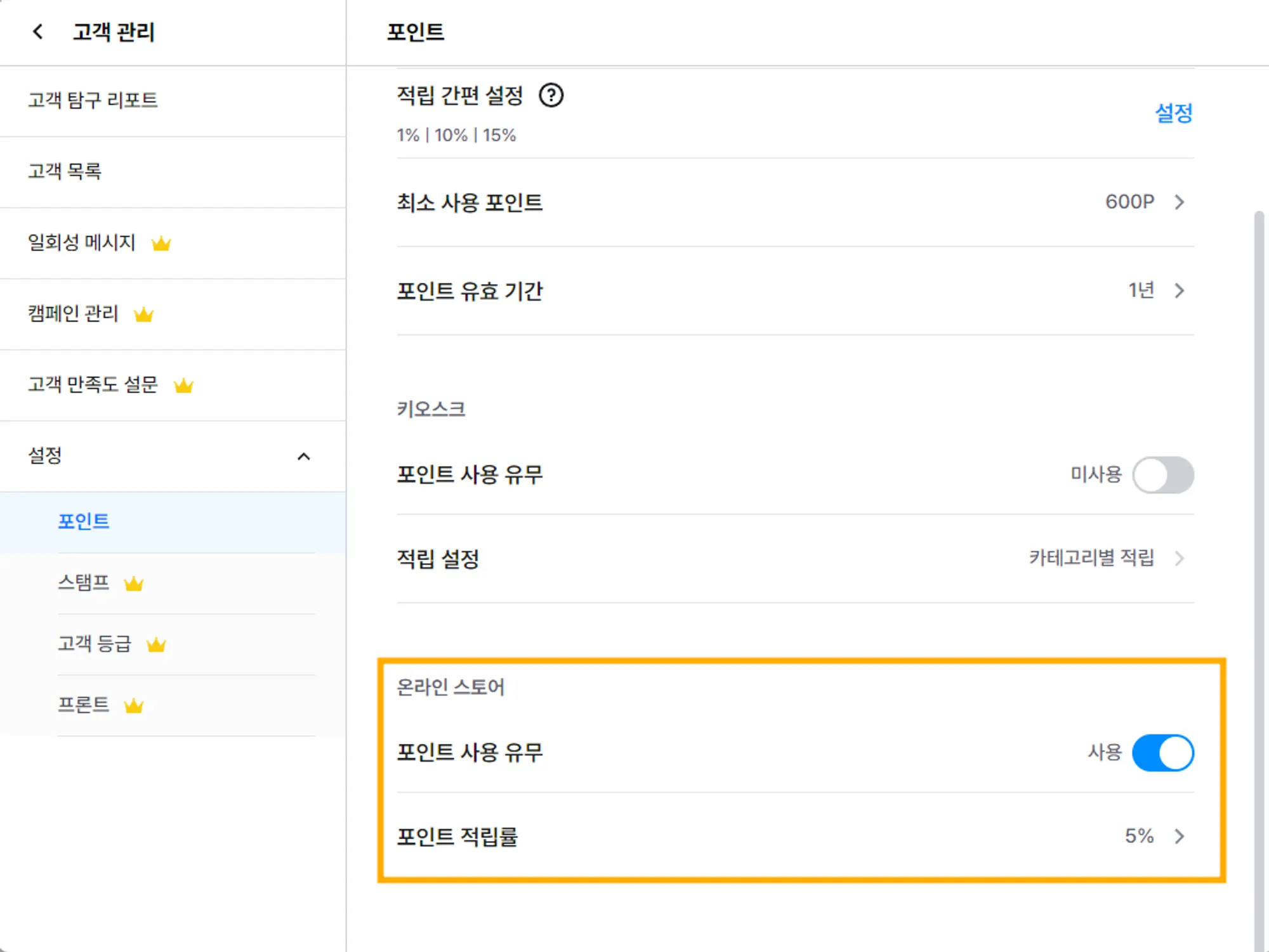 2) [포인트] 내 온라인 스토어에서 포인트 사용 유무와 적립률을 설정합니다.