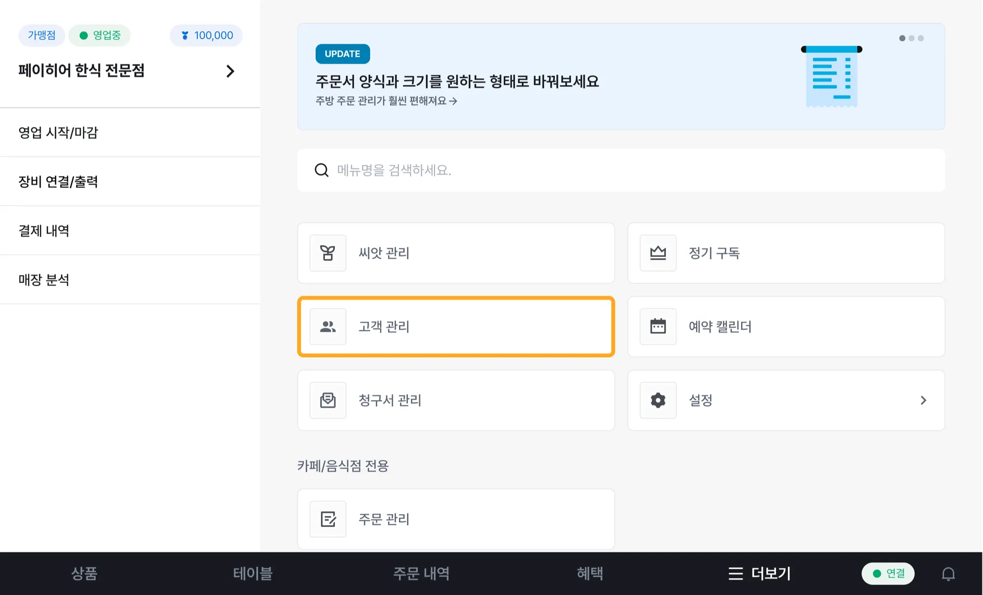 1) [더보기] → [고객 관리]를 눌러주세요.