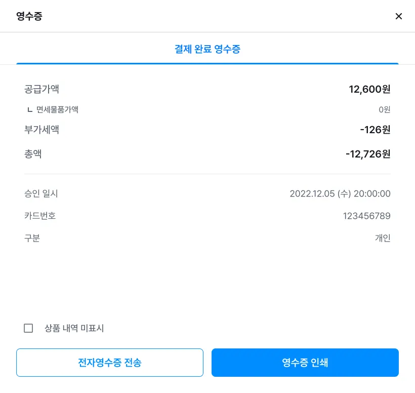 1) [결제 내역] 탭에서 원하는 결제 내역을 누르고, [영수증 보기] 버튼을 눌러주세요.