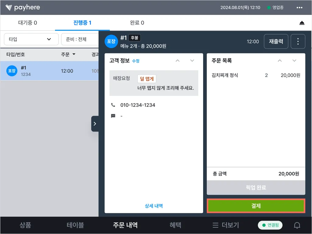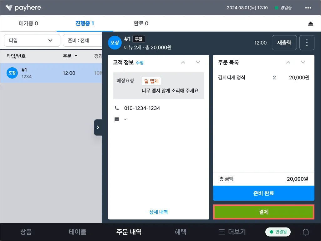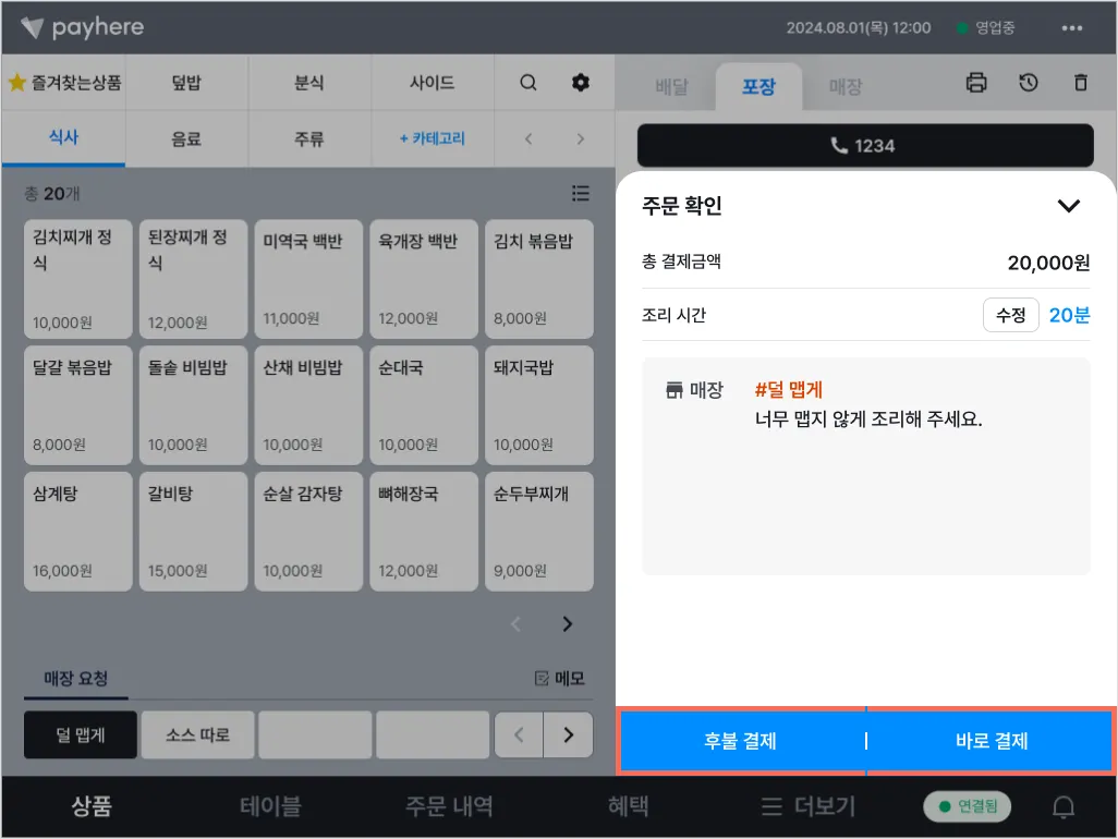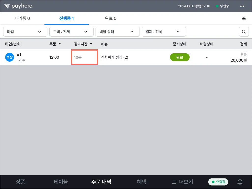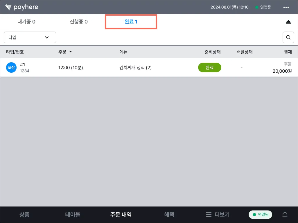 주문이 완료로 처리되어도 결제가 필요한 포장 주문은,