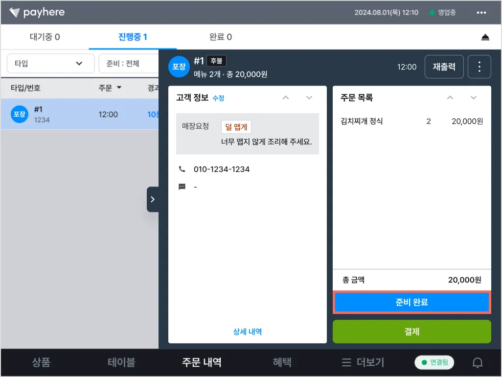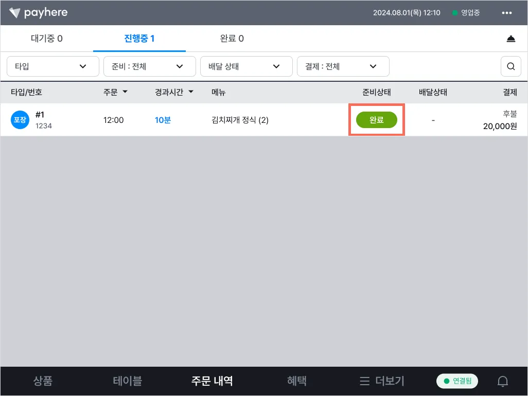 2) 주문 상태가 ‘완료’로 변경됩니다.