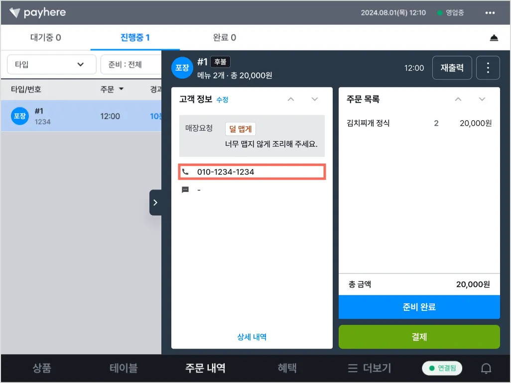 [주문 내역] 탭에서 입력한 고객 연락처를 확인할 수 있어요.