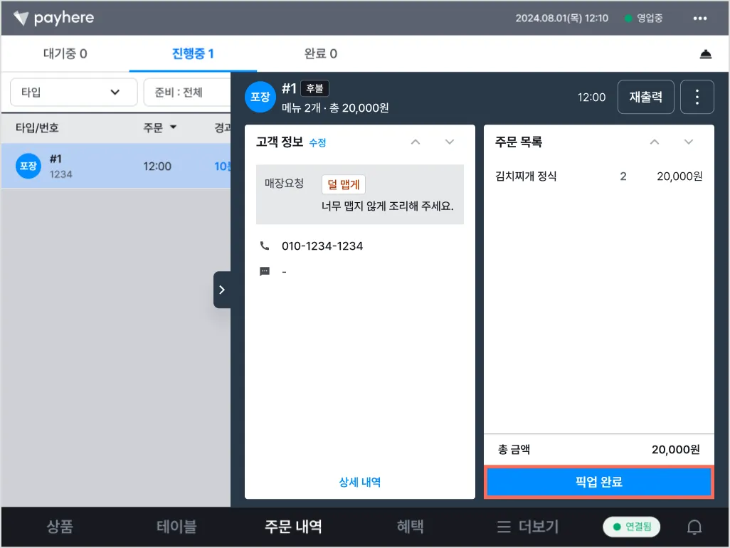 1) 고객에게 메뉴를 전달했다면 해당 주문을 선택한 후 [픽업 완료]를 눌러주세요.