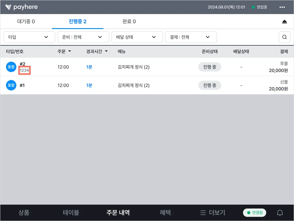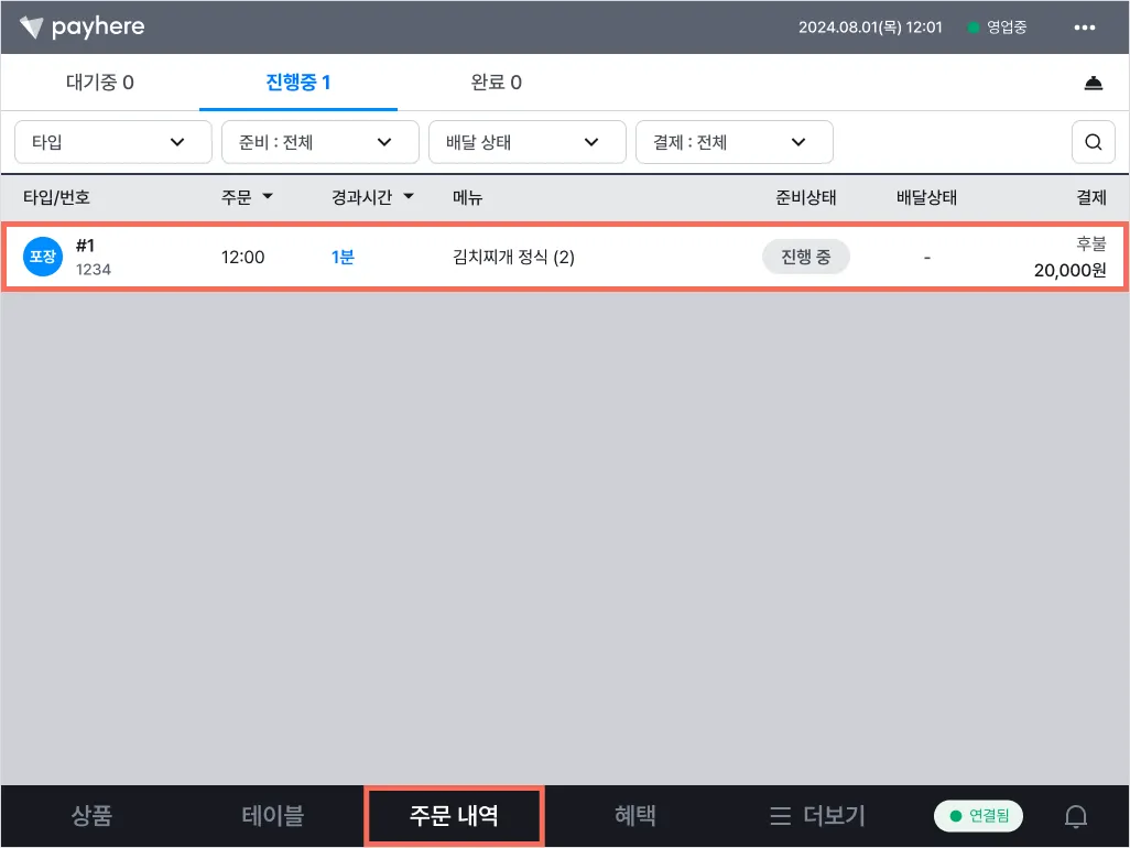 1) [후불 결제]를 누르면 [주문 내역] 탭에 주문이 즉시 생성됩니다.