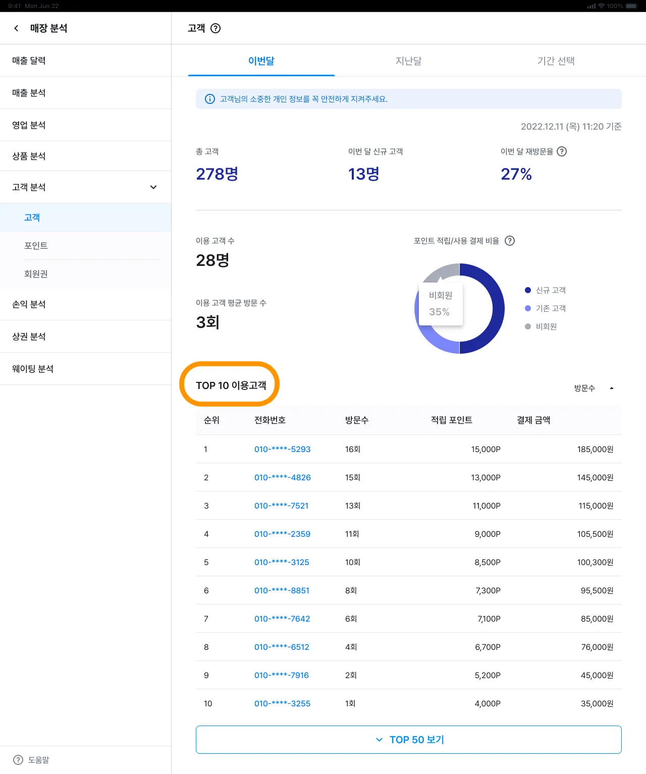 스크롤을 내리면 TOP 10 이용 고객 확인이 가능합니다.