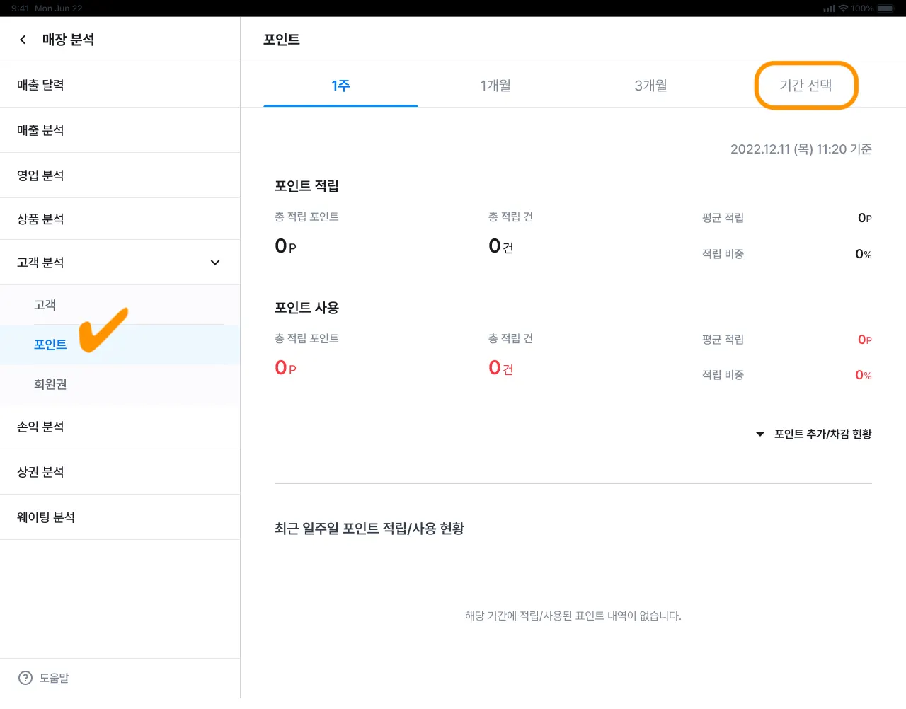 고객분석의 포인트탭을 눌르고 기간 선택탭을 눌러 기간 설정 후 조회