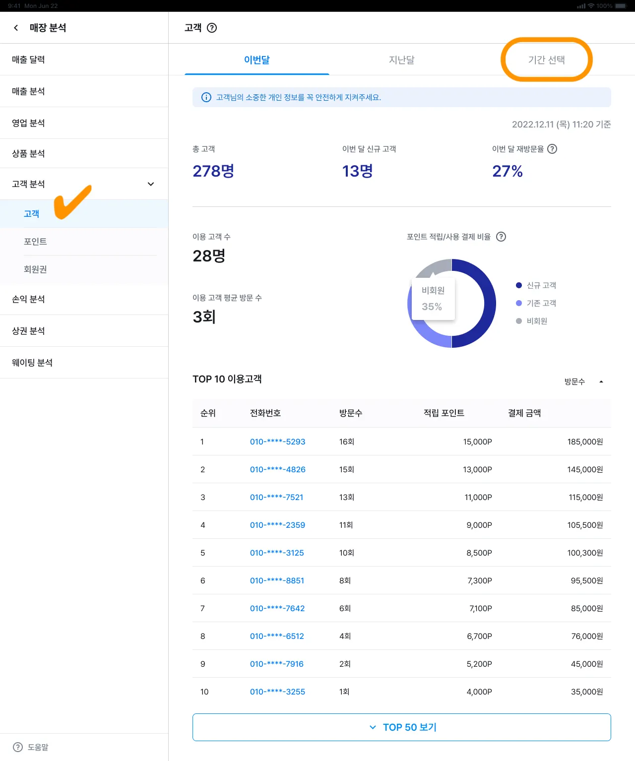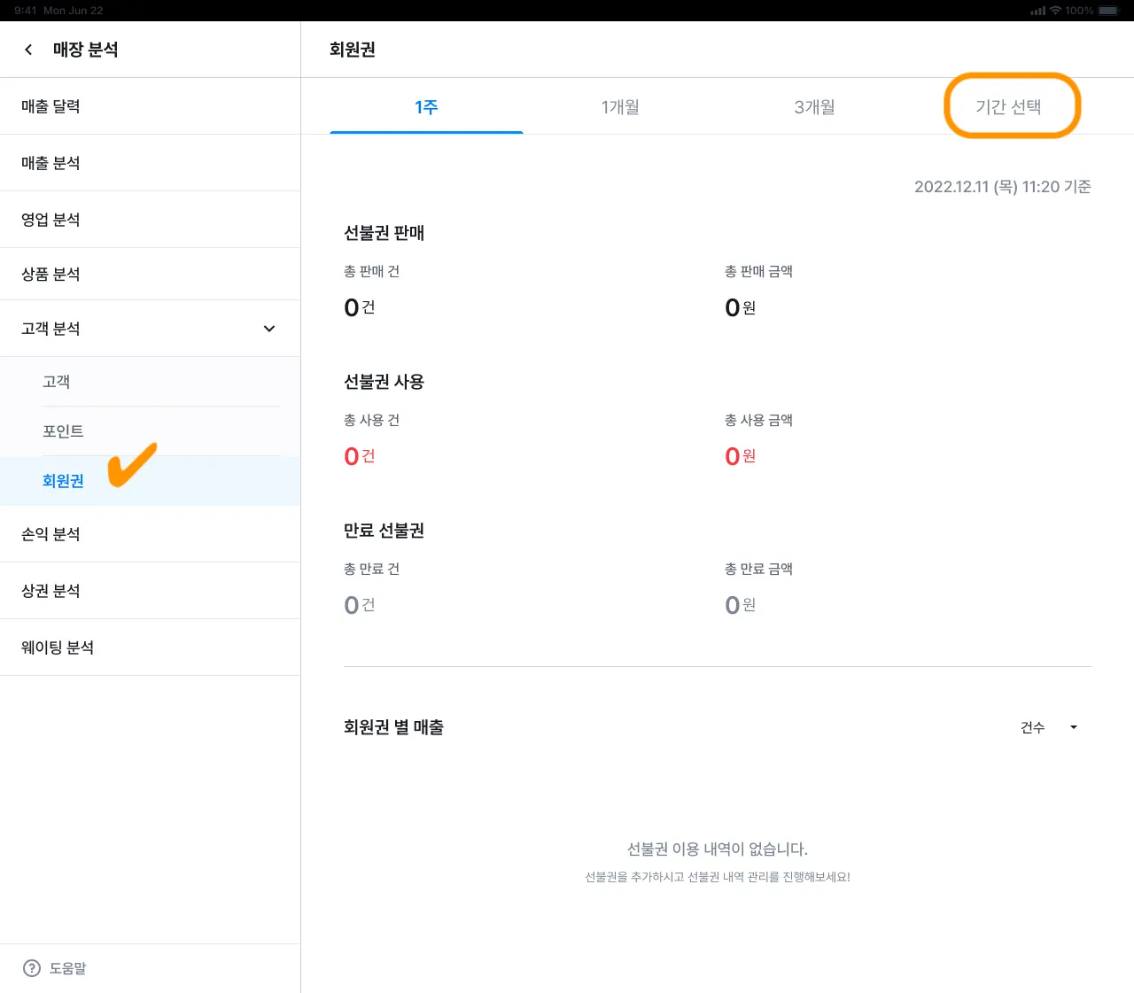 고객분석의 회원권 탭을 누르고 기간 선택 탭을 눌러 기간을 설정한 후 조회할 수 있습니다.