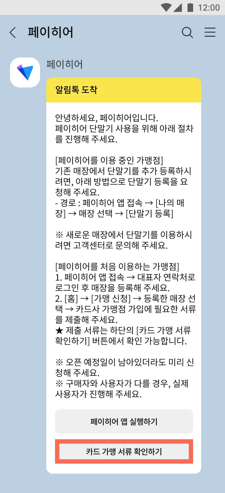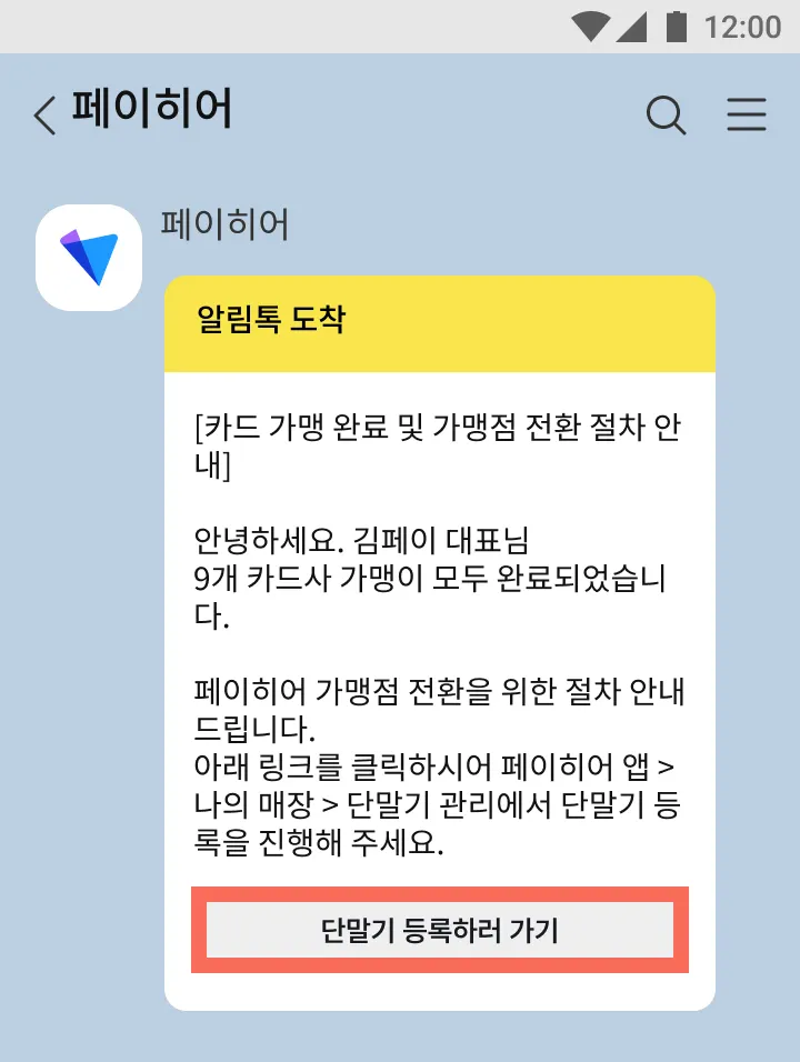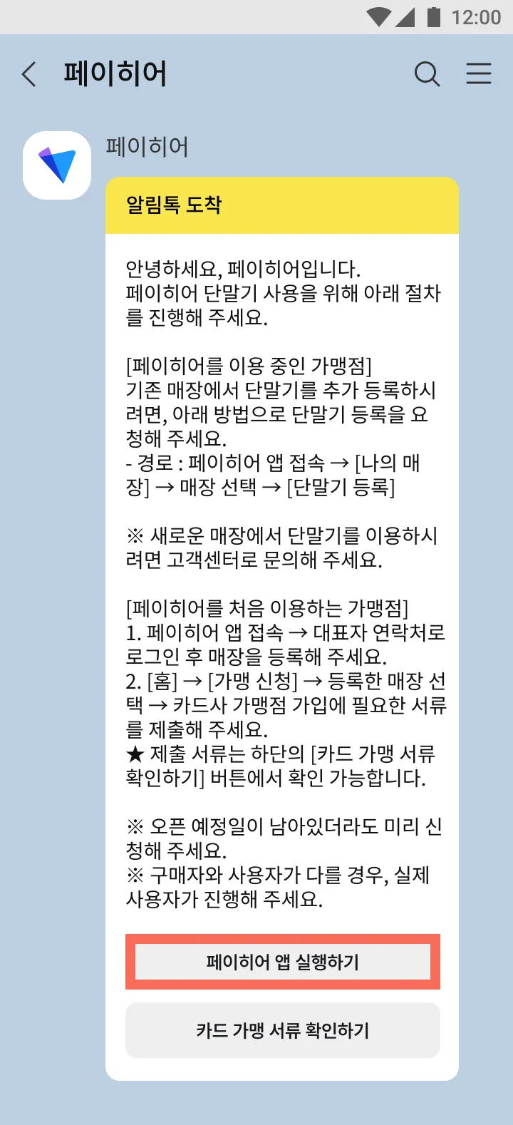 2) 알림톡 하단의 [페이히어 앱 실행하기]를 눌러 페이히어 앱 가입과 매장 생성을 진행해 주세요.