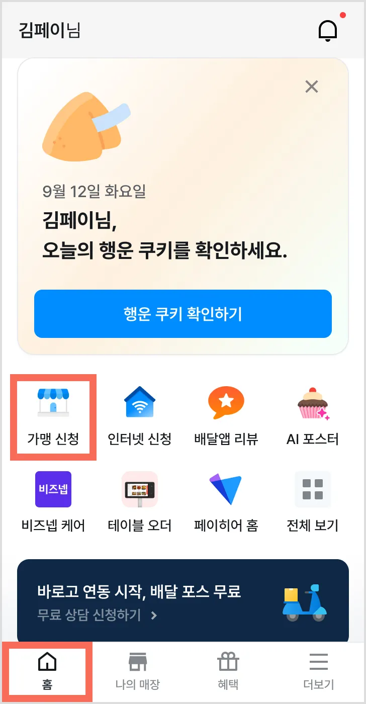 3) 페이히어 앱 [홈] 탭 → [가맹 신청]을 눌러 서류를 접수해 주세요.