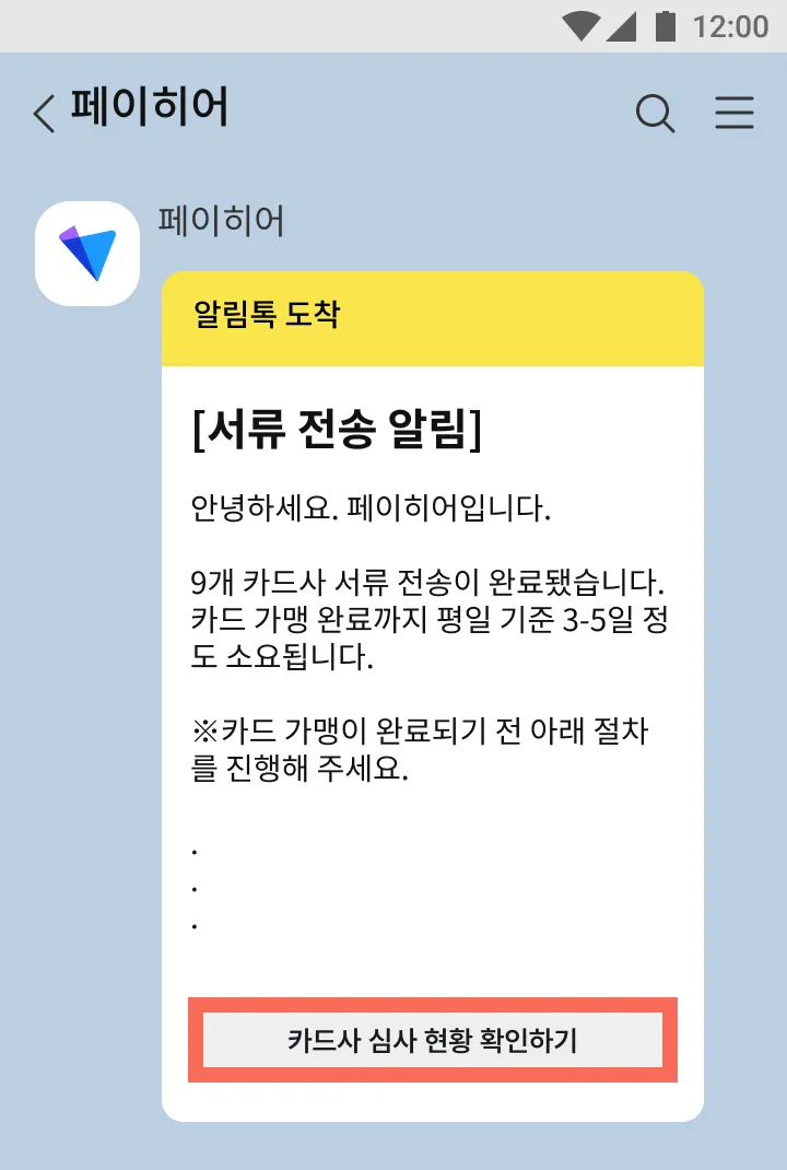 1) 알림톡 하단의 [카드 가맹 서류 확인하기]를 눌러 구비 서류를 확인해 주세요.