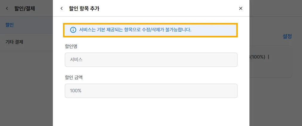 [서비스] 버튼은 기본 제공되는 할인 100% 항목으로 수정이 불가합니다.