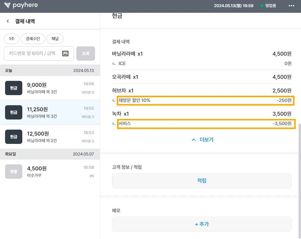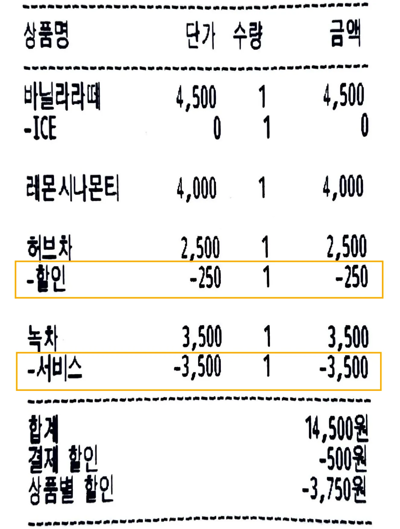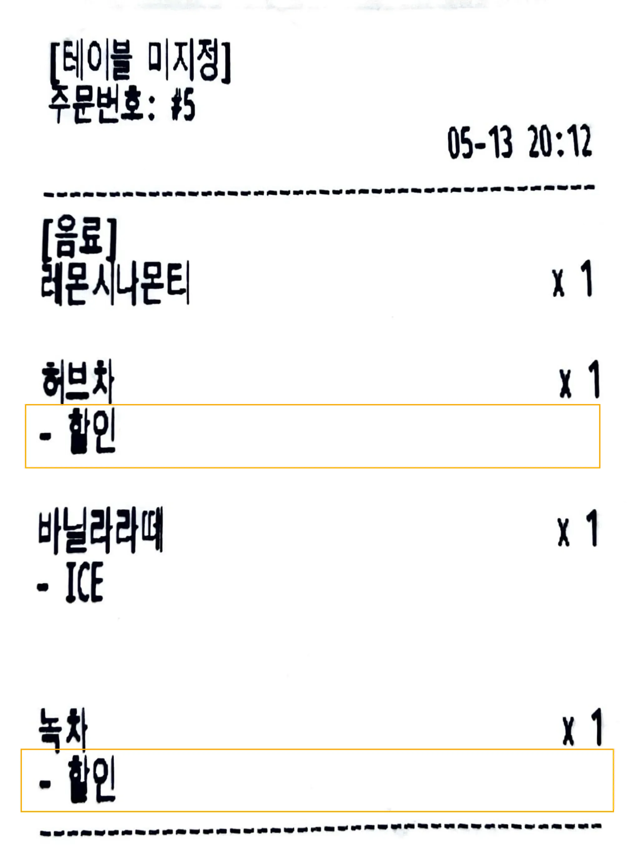 출력된 영수증과 주문서에서는 ‘할인’ 또는 ‘서비스’로만 통칭됩니다.