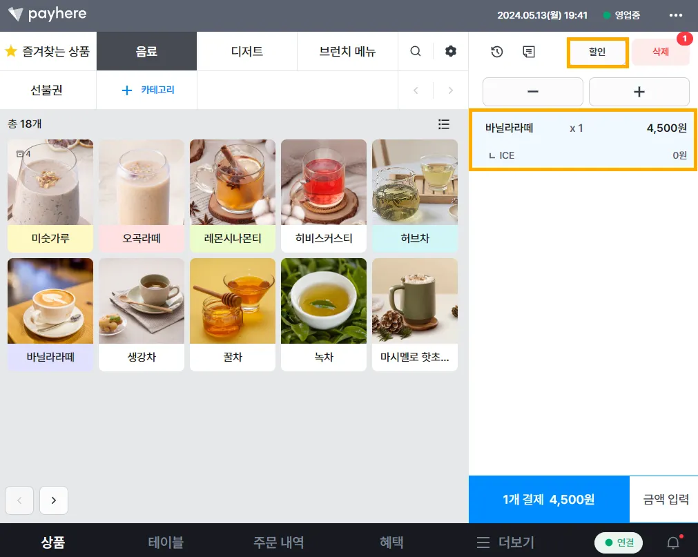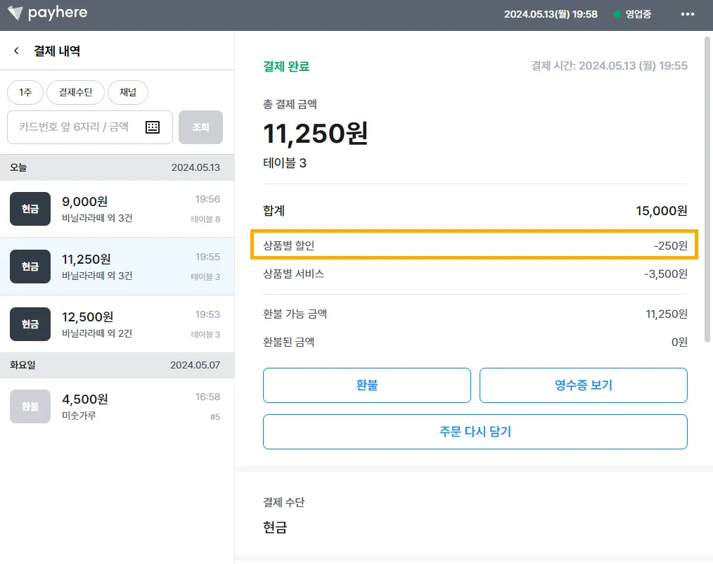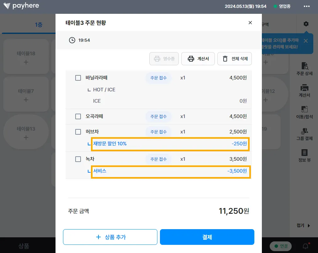 [테이블] 탭에서 상품별 할인을 적용할 경우 해당 테이블의 주문 현황에서도 적용된 할인 항목을 확인할 수 있습니다.