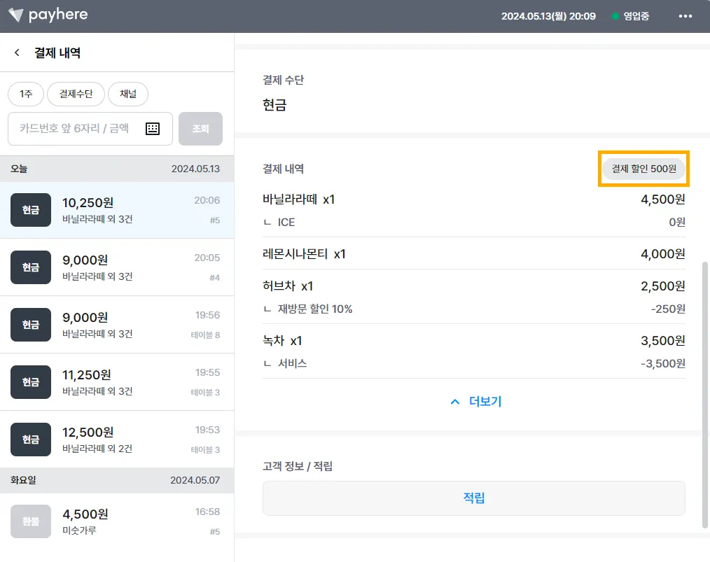 [더보기] → [결제 내역]에서도 적용된 상품별 혹은 전체 금액 할인/서비스 내역을 확인할 수 있습니다.