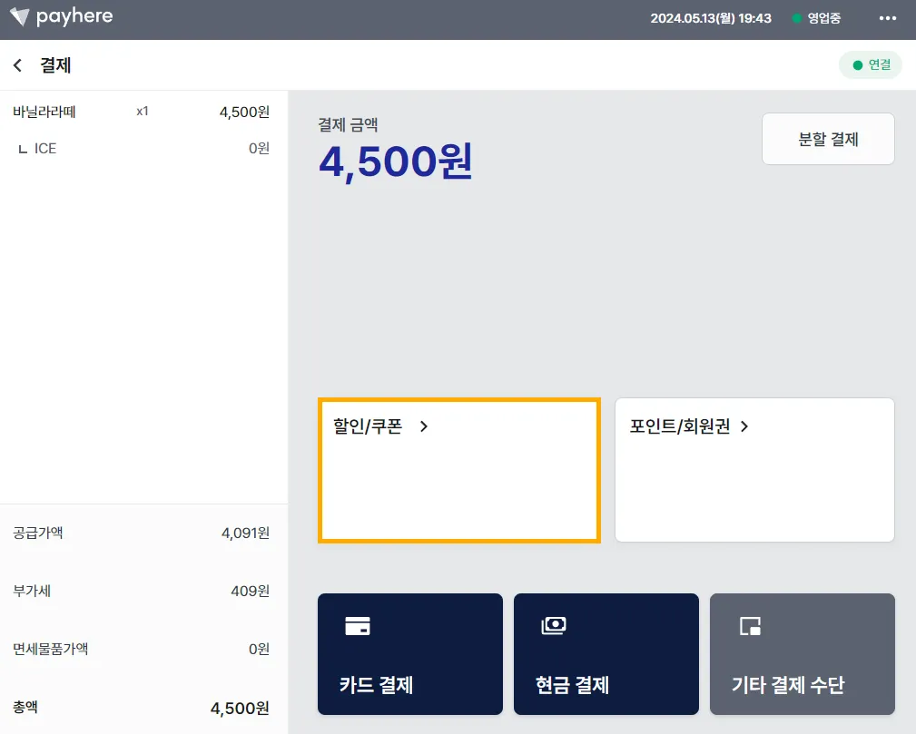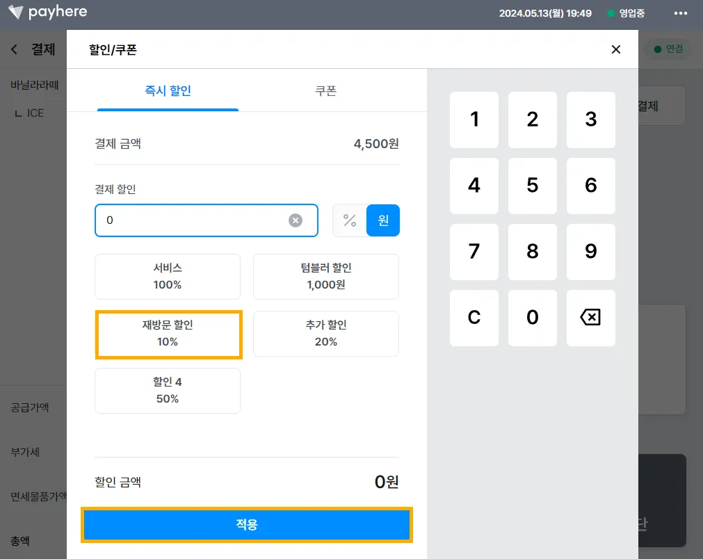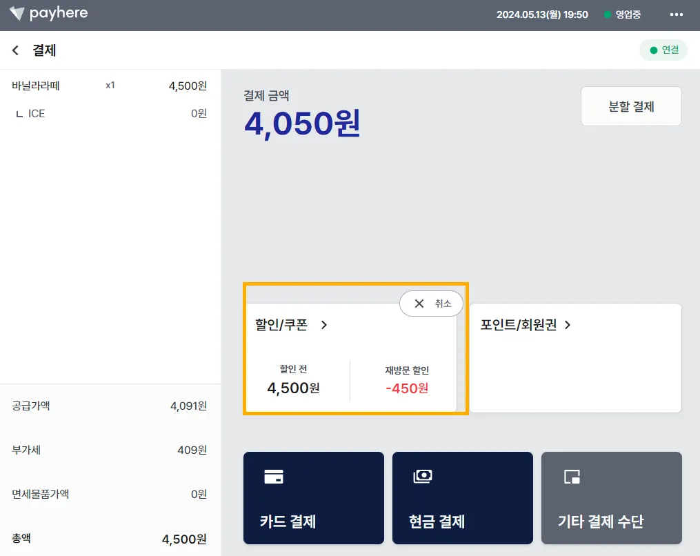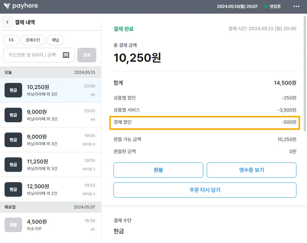 2) 적용된 할인은 주문 목록과 결제 화면에서 확인할 수 있습니다.