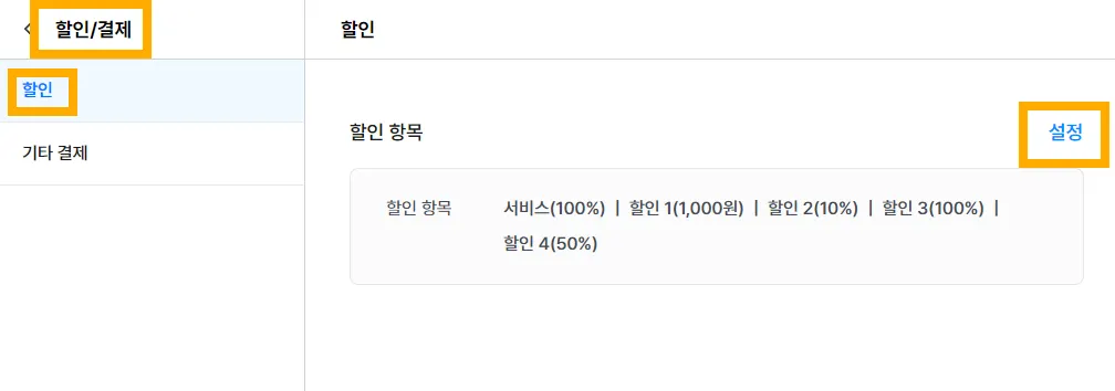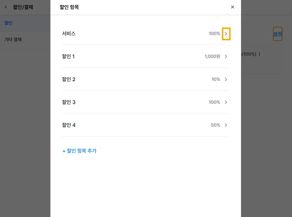2) 고정으로 제공되는 [서비스] 버튼을 제외한 나머지 [할인 항목]은 수정 및 삭제가 가능합니다.