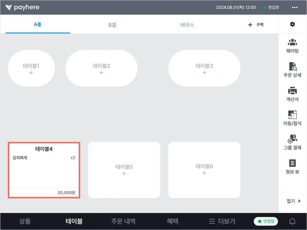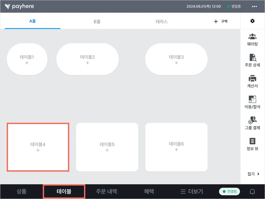 1) 주문이 입력된 [테이블]을 선택해 주세요.