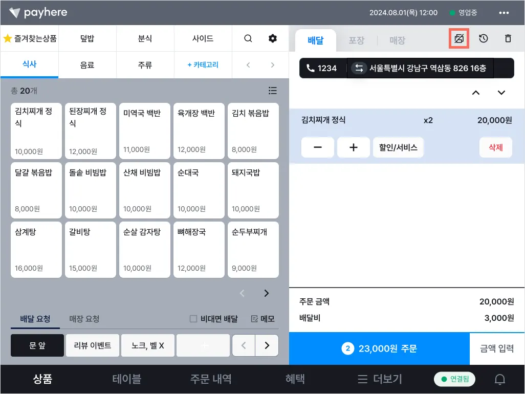 1) [상품] 탭에서 메뉴를 담고 우측 상단에 있는 [