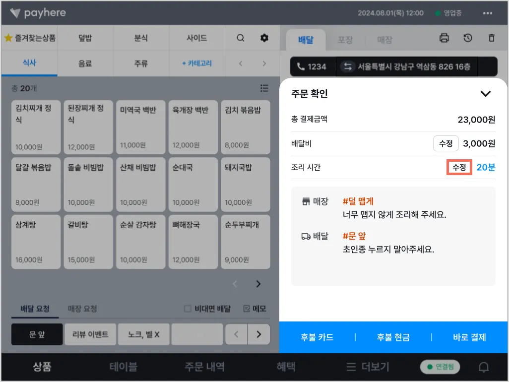 배달 요청 전까지 배달비 또는 조리 시간을 변경할 수 있어요.