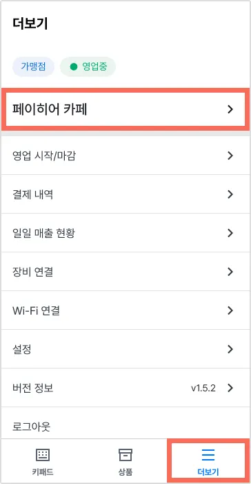 [더보기] 탭은 매장 · 사업자 정보 및 7가지 기능을 제공하고 있어요.