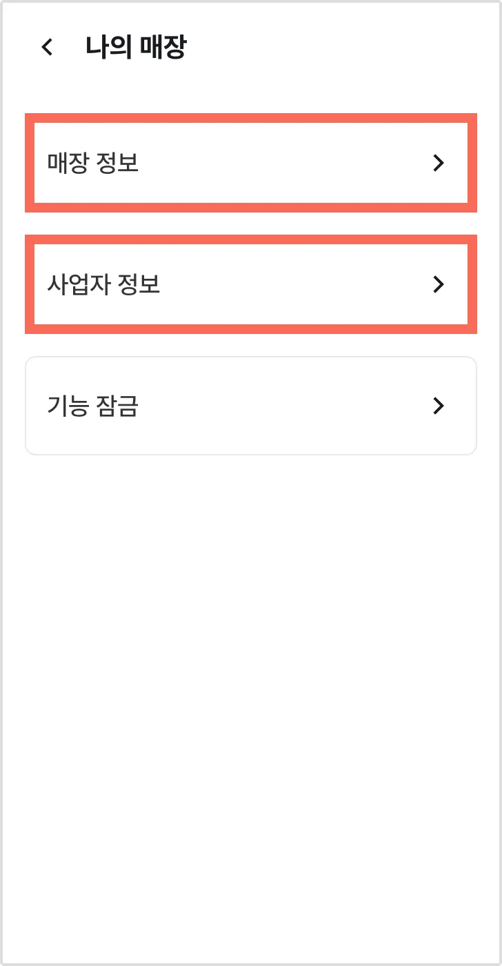 1) [매장명 >] → [매장 정보 >] 또는 [사업자 정보 >]를 눌러주세요.