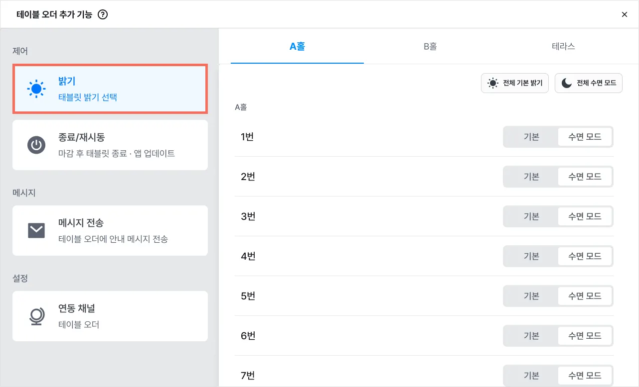 전체 설정: [전체 기본 밝기] · [전체 수면 모드]