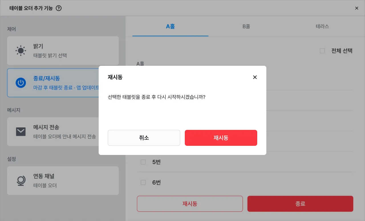 4) [재시동] → [재시동]을 선택하면 태블릿의 전원이 껐다 켜집니다.