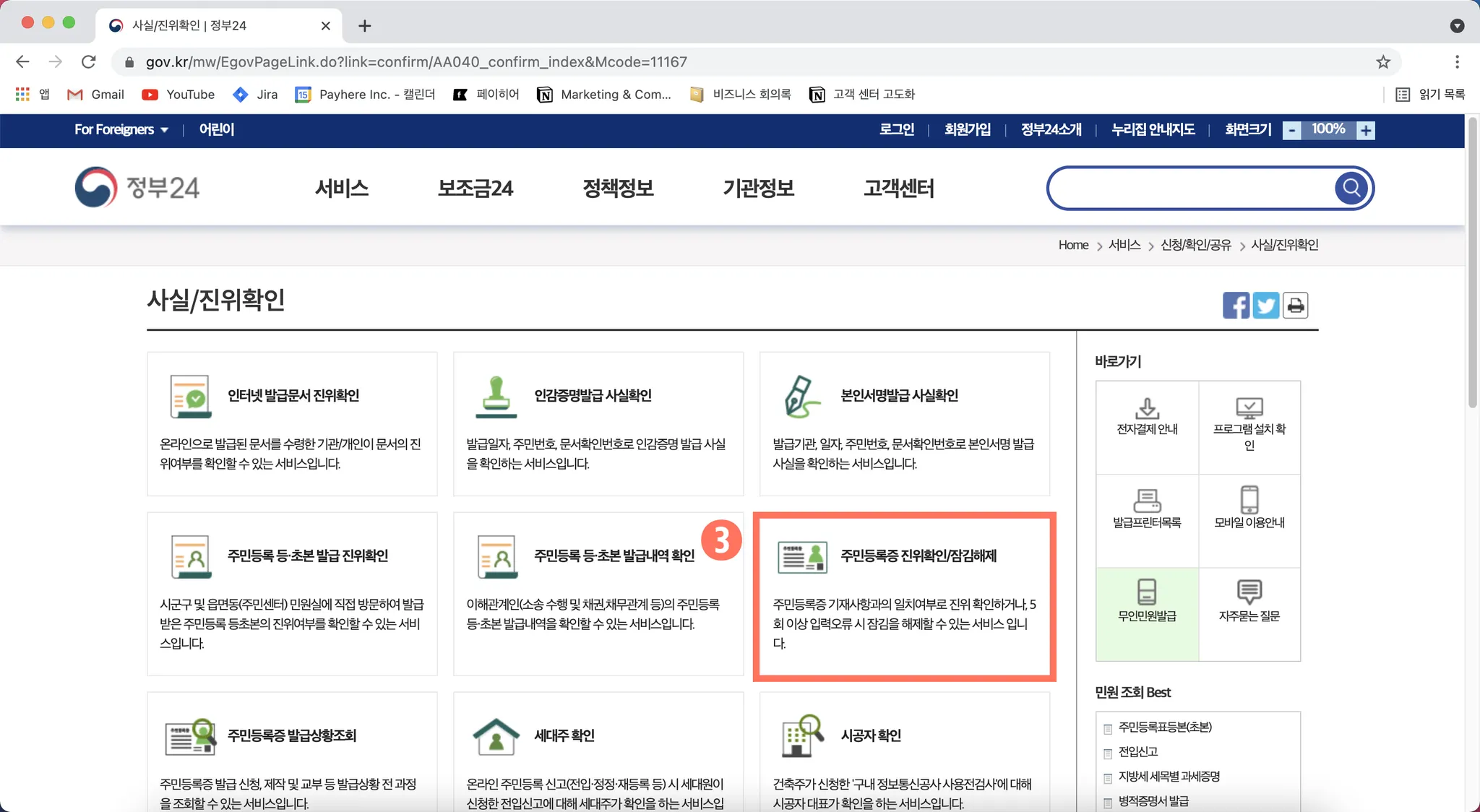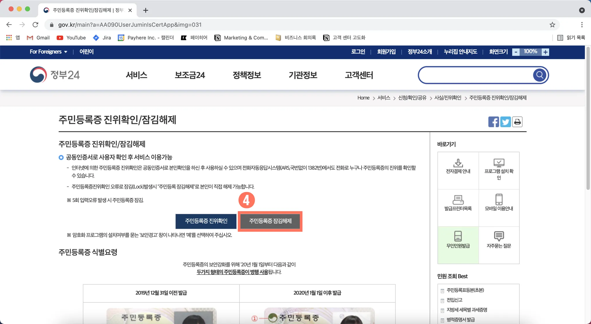 4) [주민등록증 잠김해제]를 클릭합니다.