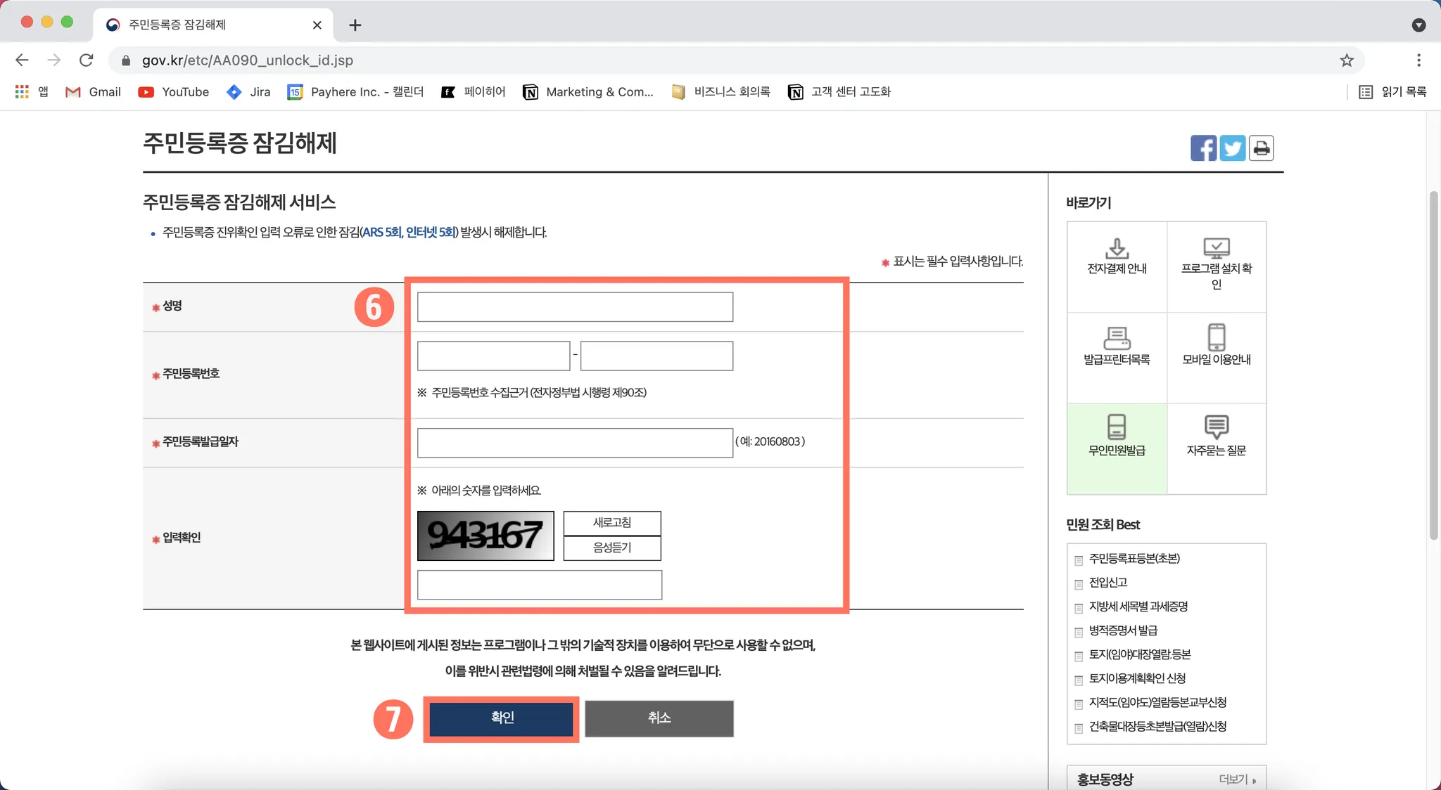 6) 본인 인증을 위한 개인정보 입력 후, [확인]을 클릭하면 잠김이 해제됩니다.