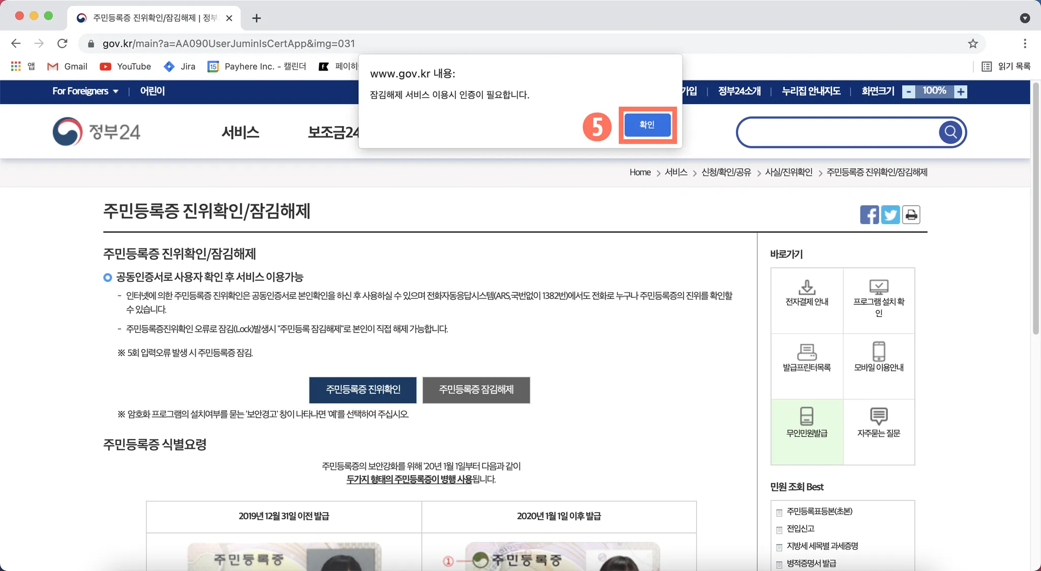 5) '잠김해제 서비스 이용시 인증이 필요합니다' 라는 안내 메시지창이 뜨면 [확인]을 클릭합니다.