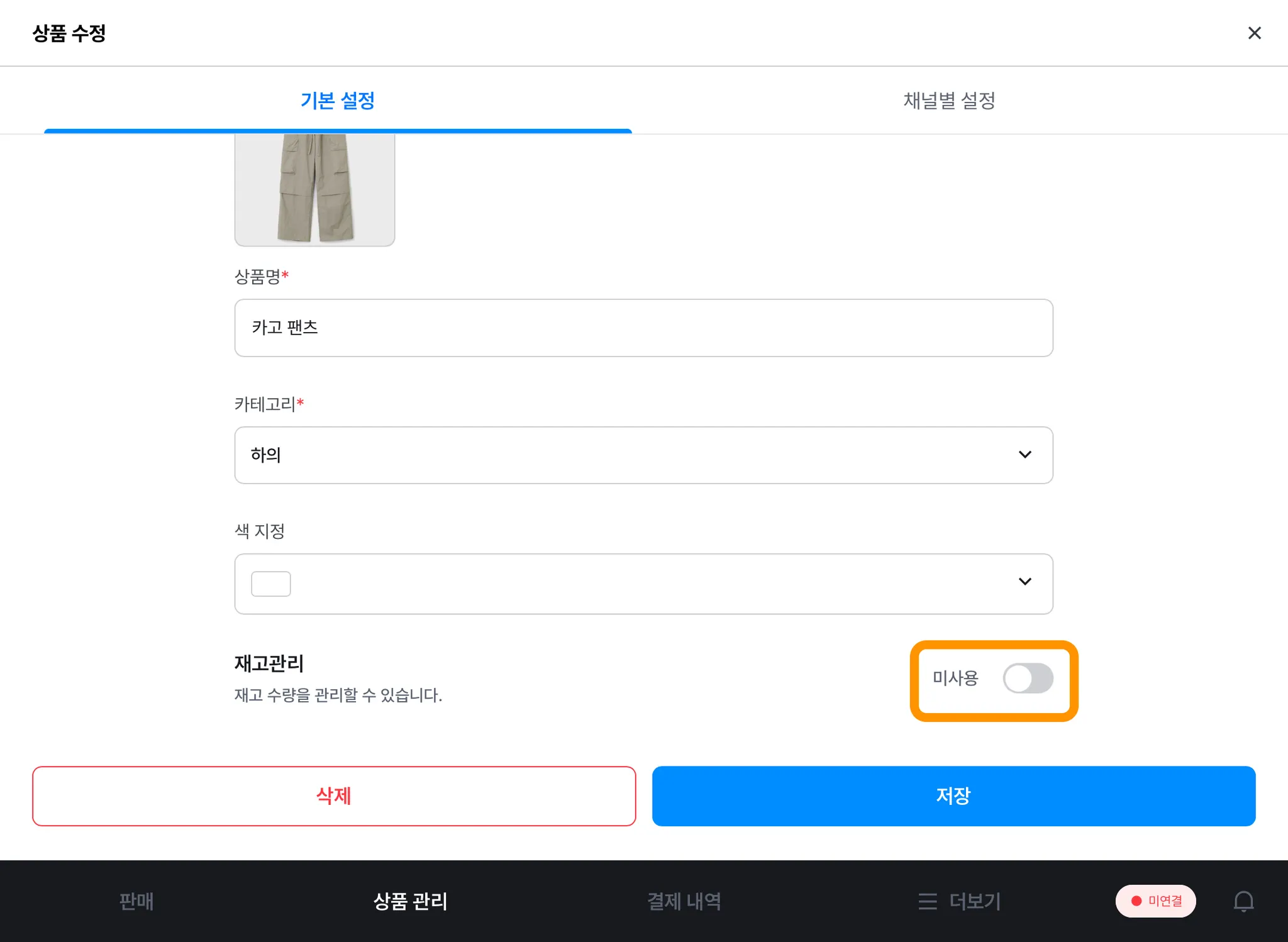 상품을 추가하거나 수정할 때 재고관리 기능을 [미사용]으로 변경하면 재고가 표시되지 않습니다.