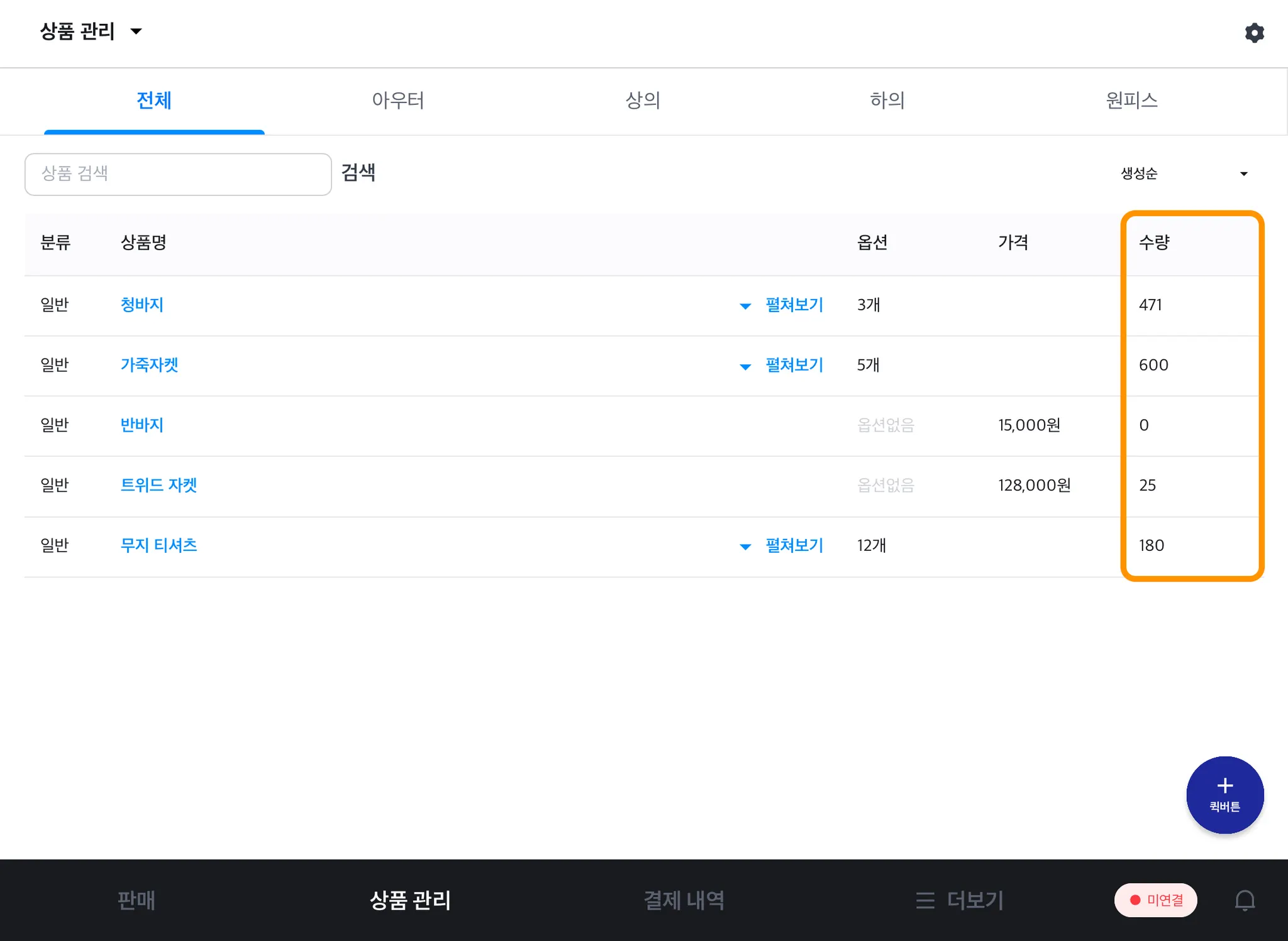 [판매] 탭, [상품 관리] 탭에서 재고가 표시되지 않습니다.