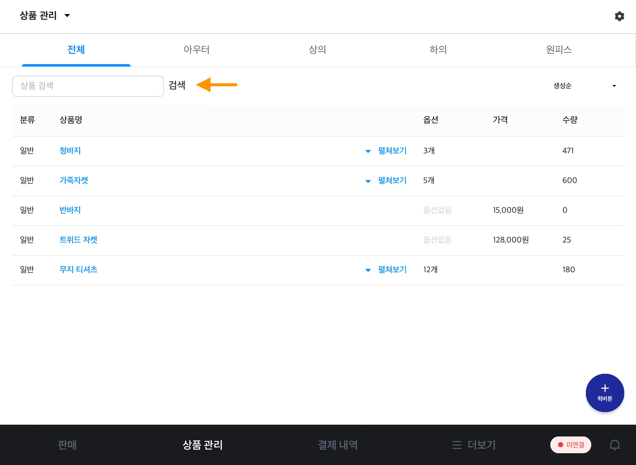 좌측 상단에 있는 [상품 검색] 부분에 재고를 알고 싶은 상품을 검색해 주세요.