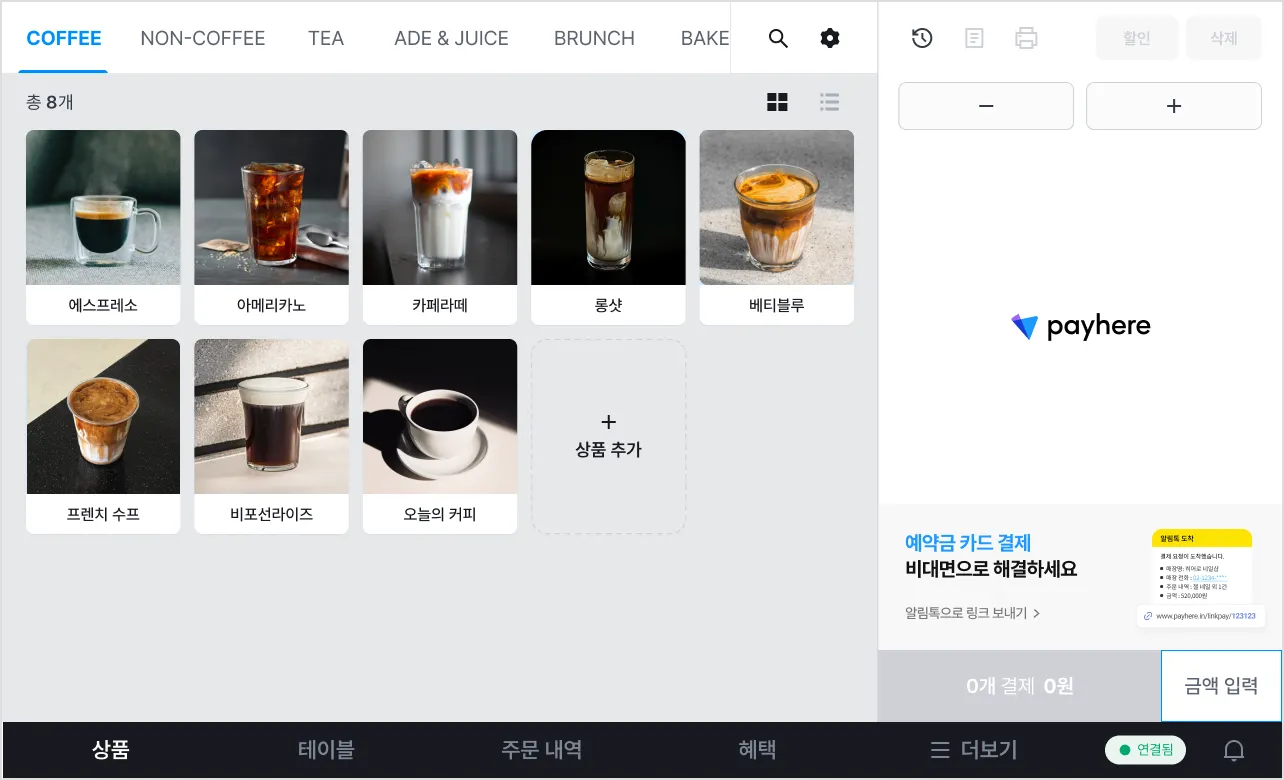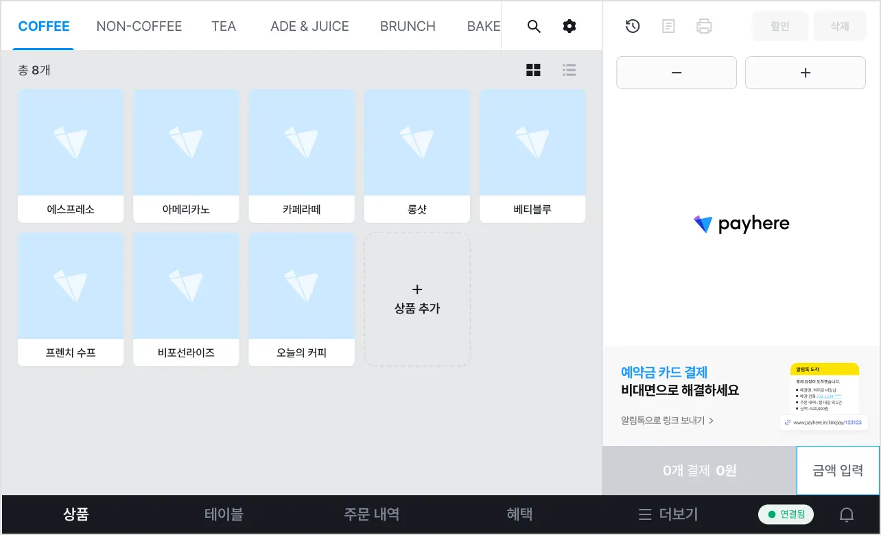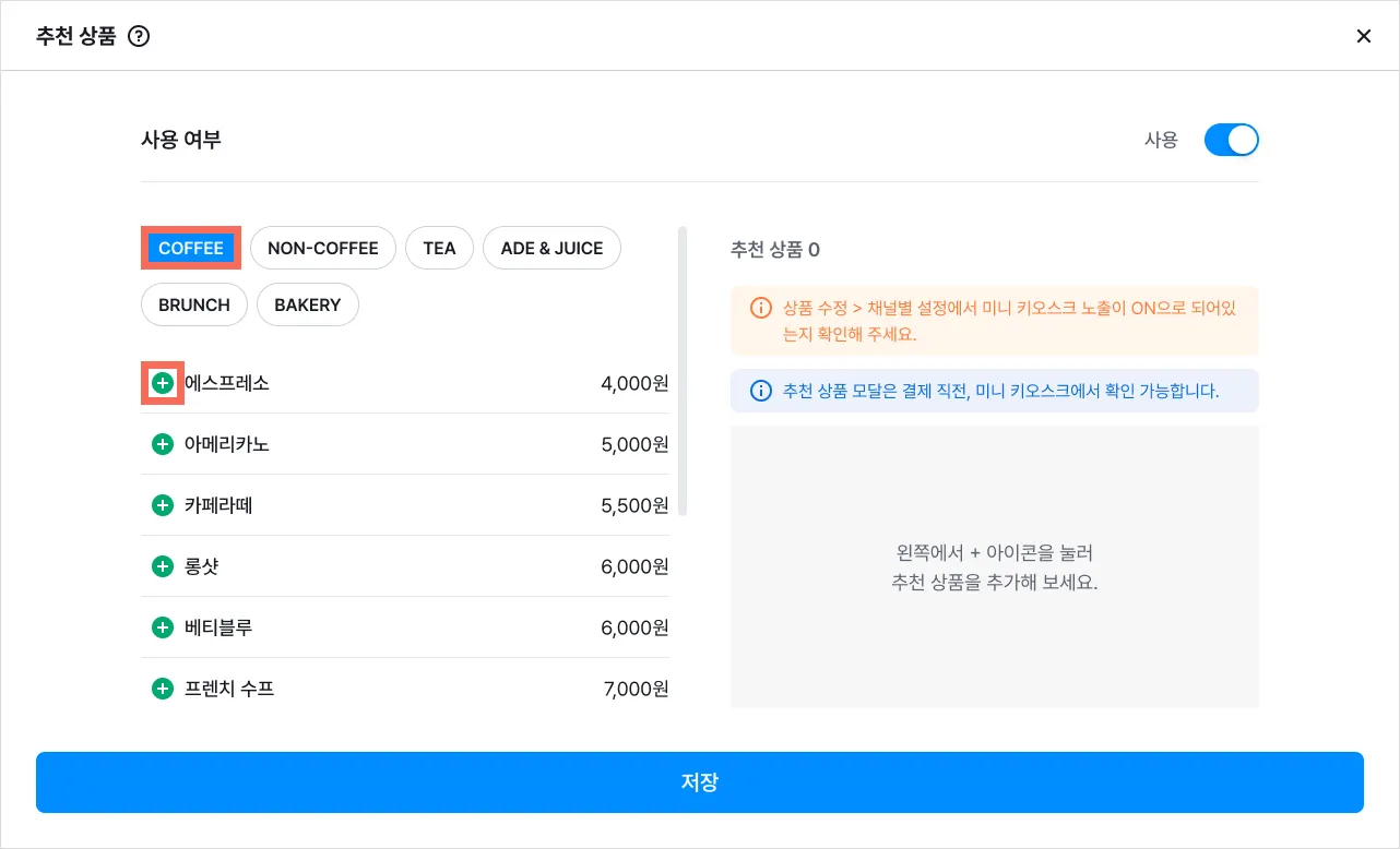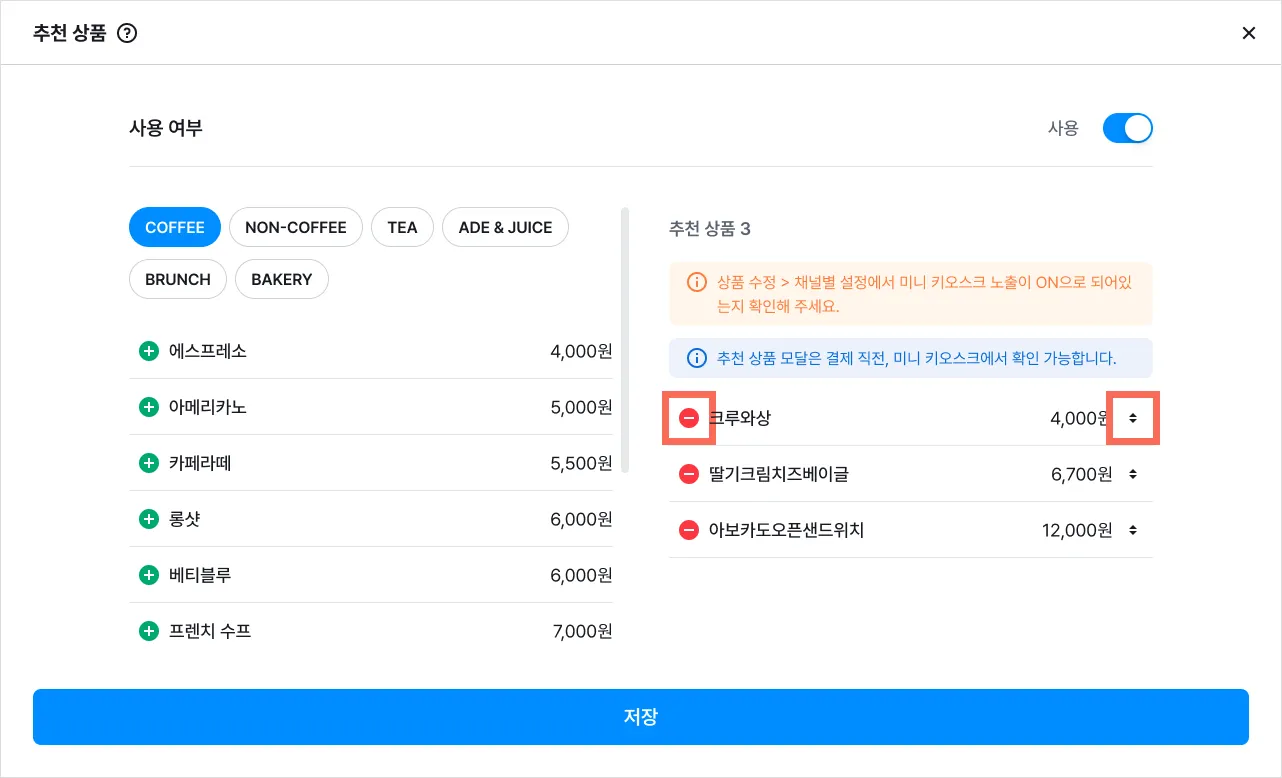 채널별 설정에서 프론트/미니 키오스크 노출 여부를 ‘사용’으로 변경해 주세요.