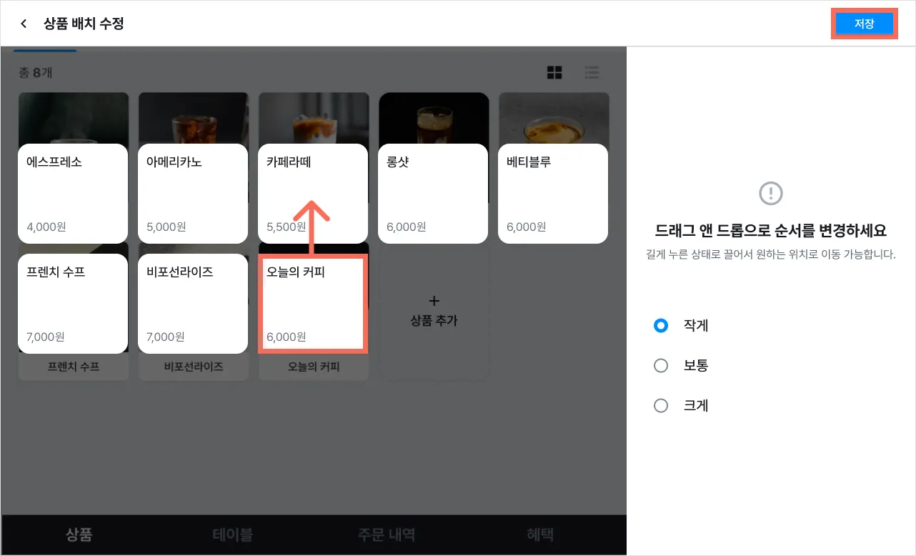 3) 순서 변경 : 상품을 꾹 누른 다음, 원하는 위치로 끌어 옮긴 후 [저장]해 주세요.