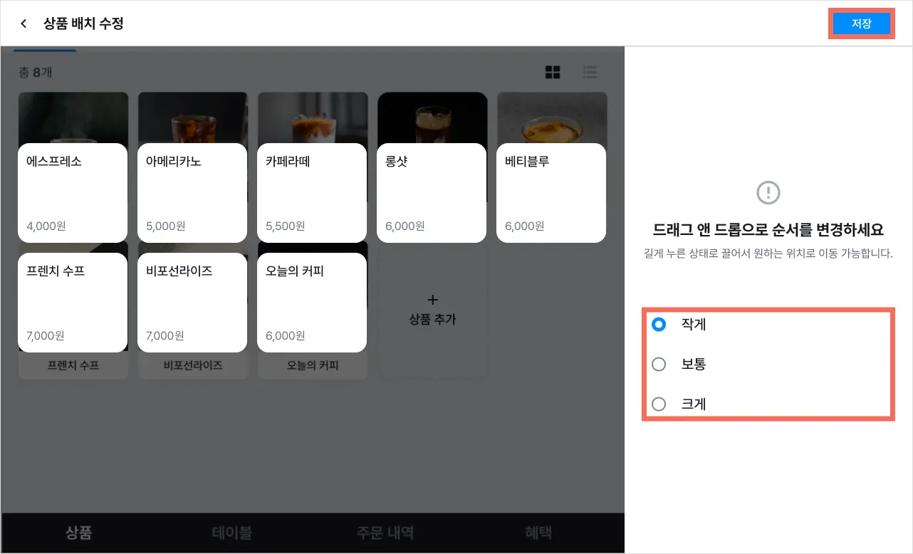 상품 아이콘 크기 또는 순서를 변경할 수 있어요.