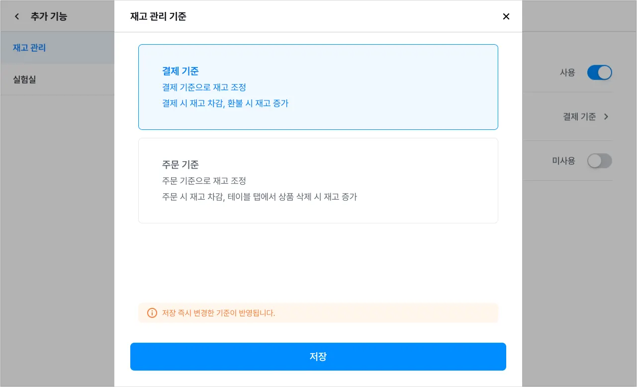 5) [결제 기준] 또는 [주문 기준] 중 한 가지를 선택한 다음 [저장]을 눌러주세요.