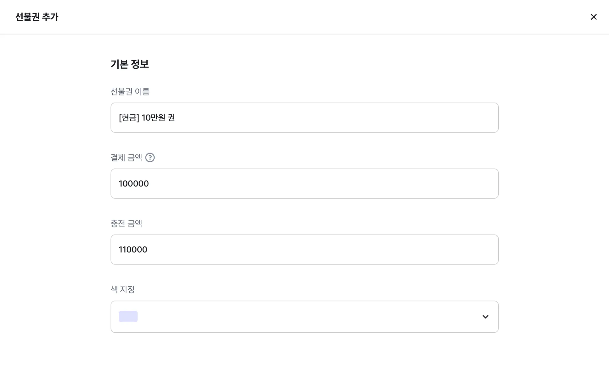 선불권 이름 : 상품명과 동일하게 노출됩니다. 예) [현금] 10만 원 권