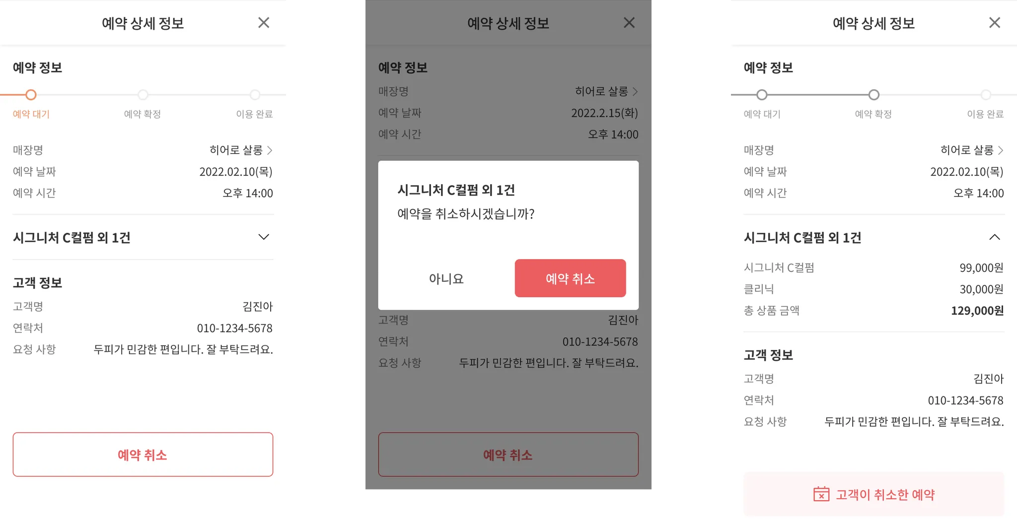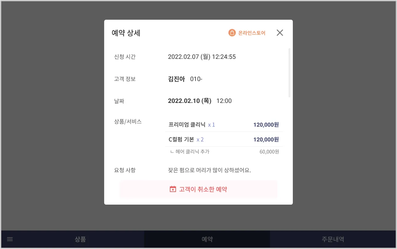 고객이 취소한 예약은 예약 상세 내역 하단에 [고객이 취소한 예약]으로 표시됩니다.