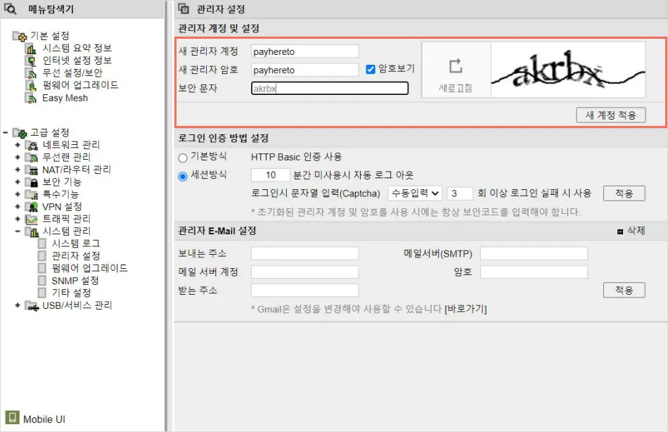 4) 새 관리자 계정과 암호를 입력한 후 [새 계정 적용]을 눌러주세요.
