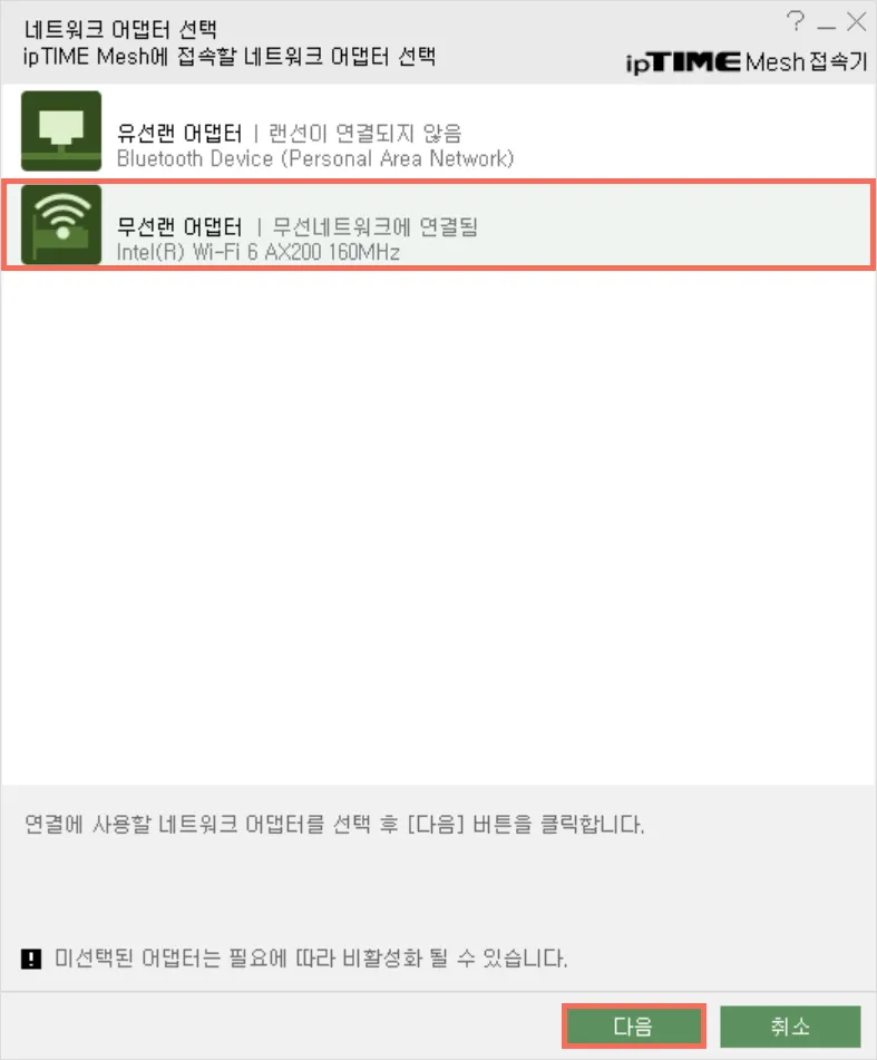 1) [무선랜 어댑터] → [다음]을 누른 다음, 검색된 공유기 아이콘 옆 [+]를 눌러주세요.