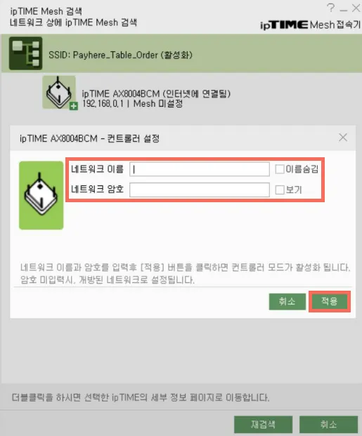 3) 네트워크 이름과 암호를 입력한 후 [적용]을 눌러주세요.