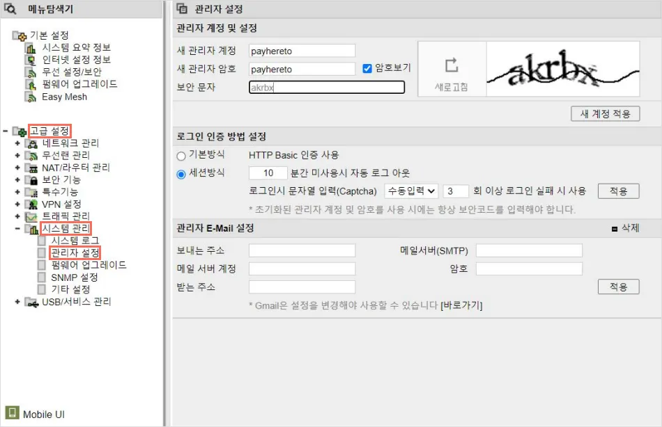 3) [고급 설정] → [시스템 관리] → [관리자 설정]을 눌러주세요.